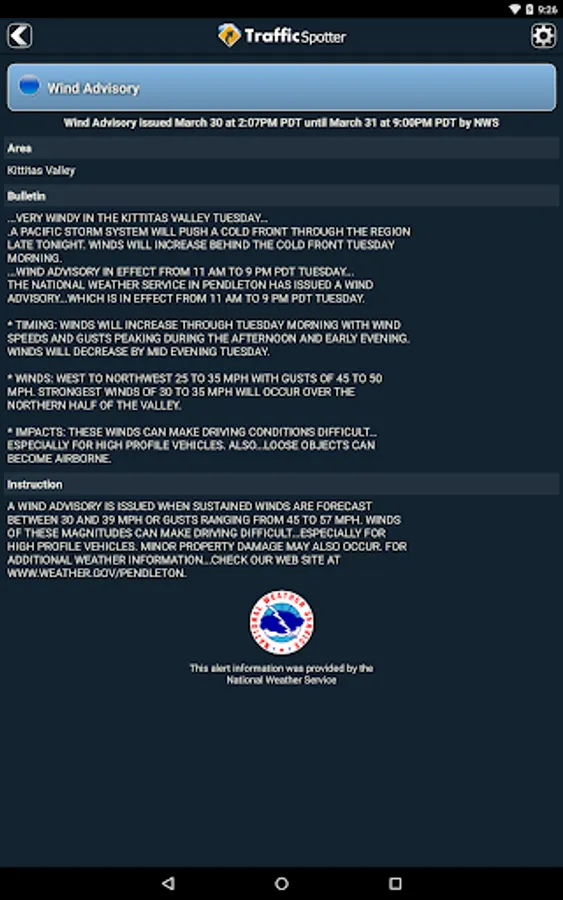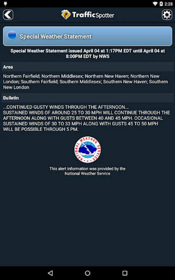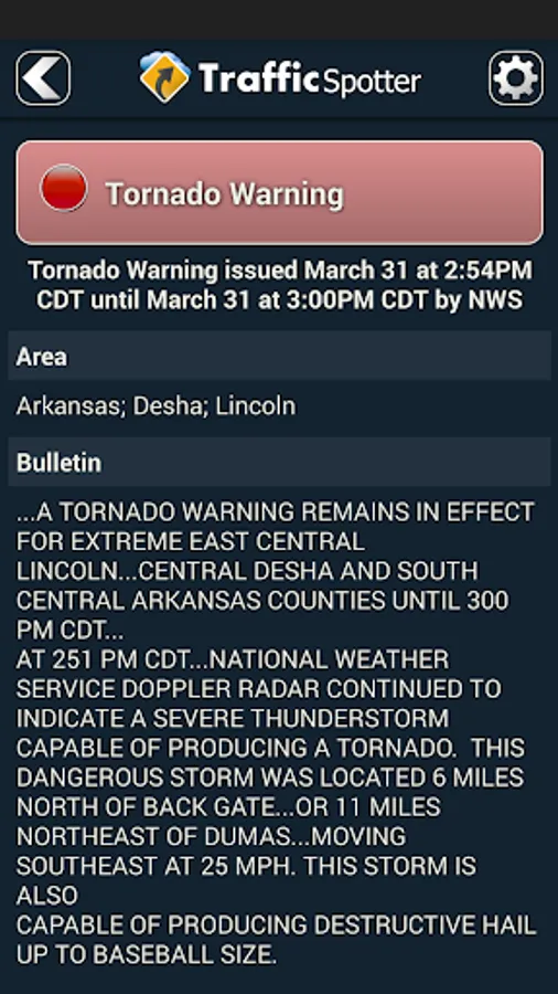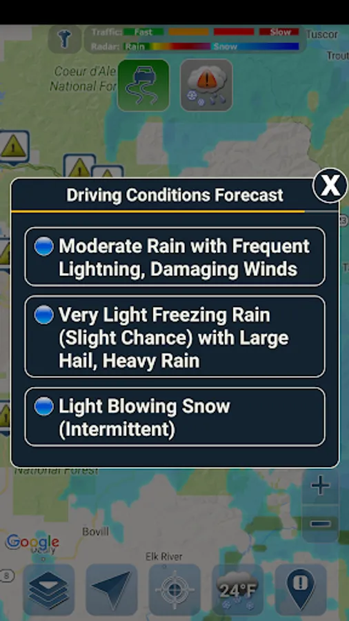 Traffic Spotter provides a driving conditions forecast based on weather that may be occurring within the next three hours in your area.