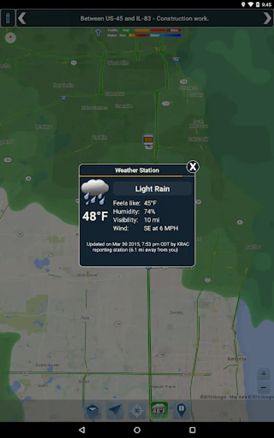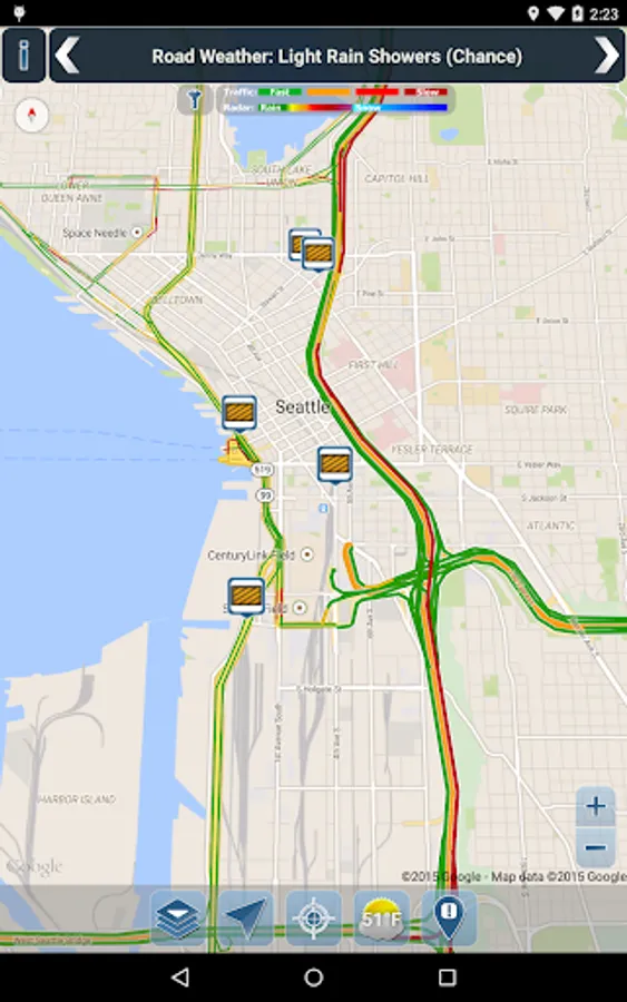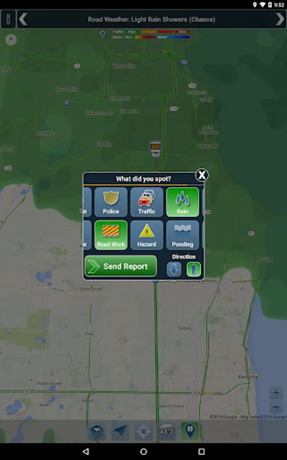 Traffic Spotter provides a Road Conditions feature, which allows you to find which roads are likely to be icy, foggy, snowy, windy, or ponding approximately within the next three hours. Road Conditions currently covers the United States of America.