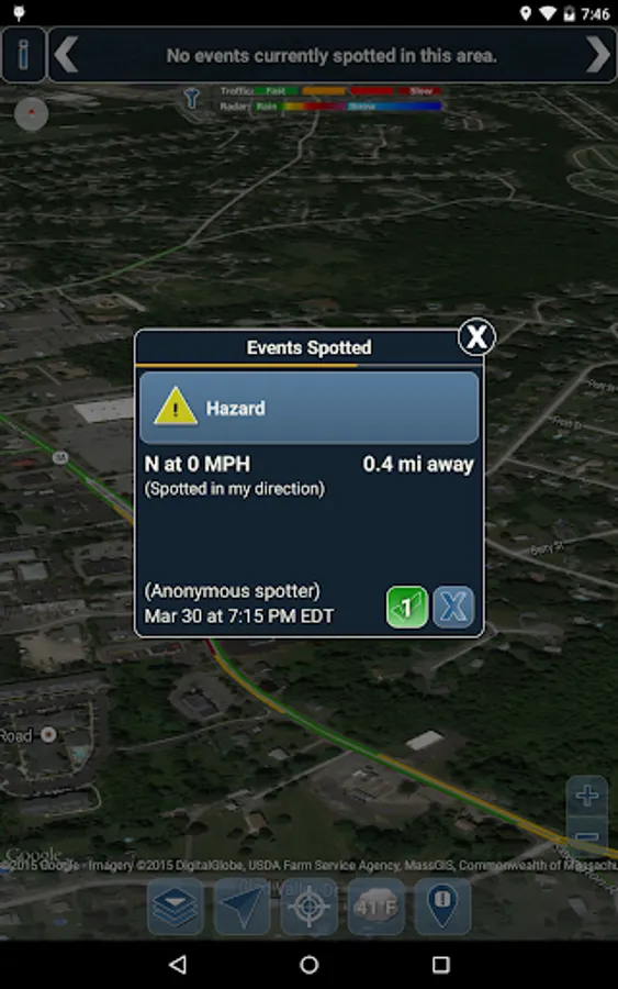 Traffic Spotter is a community driven resource. You can become a spotter and help other travelers plan their route around traffic or dangerous conditions you have encountered. If you spot an event such as an accident or heavy traffic, you can report it for other travelers to see. If you encounter an event that has already been spotted, or has expired, you can confirm or dismiss that event.