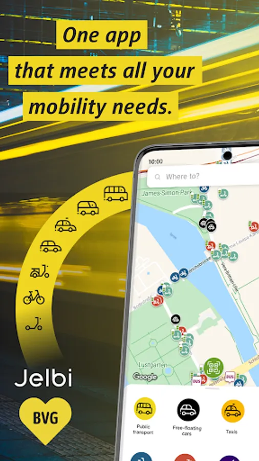 Jelbi is your mobility app for Berlin's public transport, taxi, and sharing services. Whether bus, train, scooter, bike, car, moped, or cab, your unlimited mobility in the capital is just a few clicks away. Jelbi bundles all services in just one app. Buy a public transport ticket or use the services of our mobility partners: Miles, Sixt share, Tier, Voi, Lime, Nextbike, Emmy, Bolt, and Taxi Berlin. With the BVG Jelbi app, you have access to a fleet of 70,000 vehicles.
