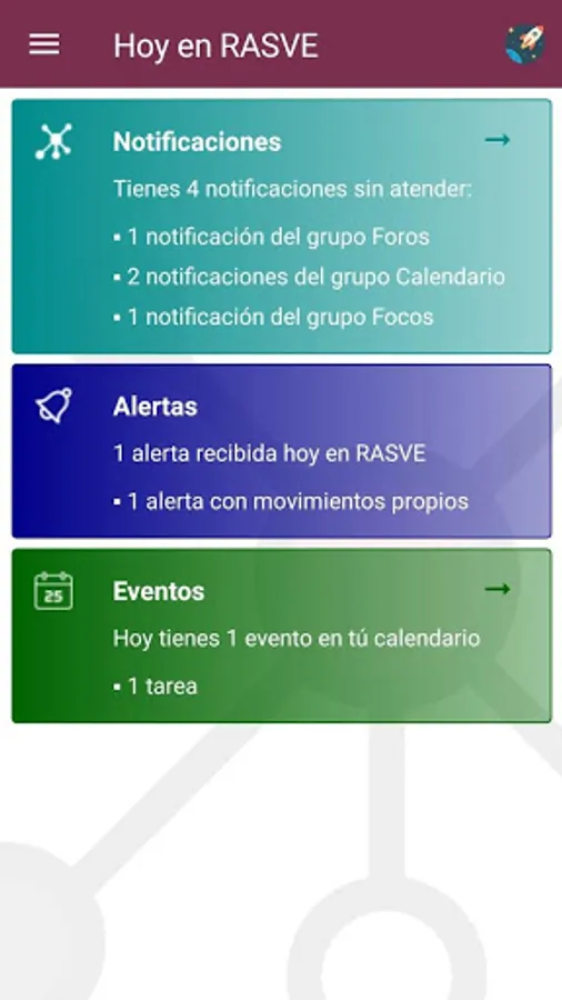 Rasve app allows you to obtain personalized information in real time from the notifications of new calendar events, work forums, surveys and other relevant documentation for the surveillance and control of diseases shared in the work groups to which the user belongs.