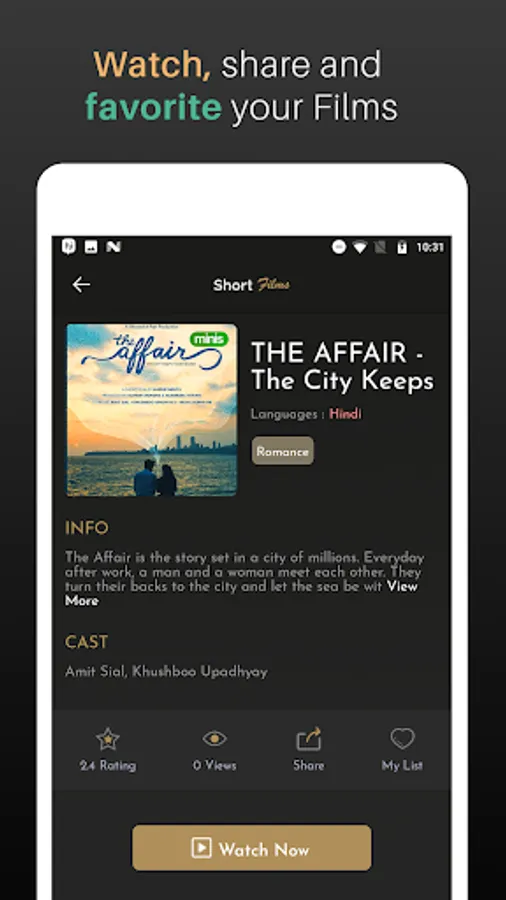 Watch Latest Short Movies/Films in this app. More than 60+ Movies are there and Database updated as the New movies launch.