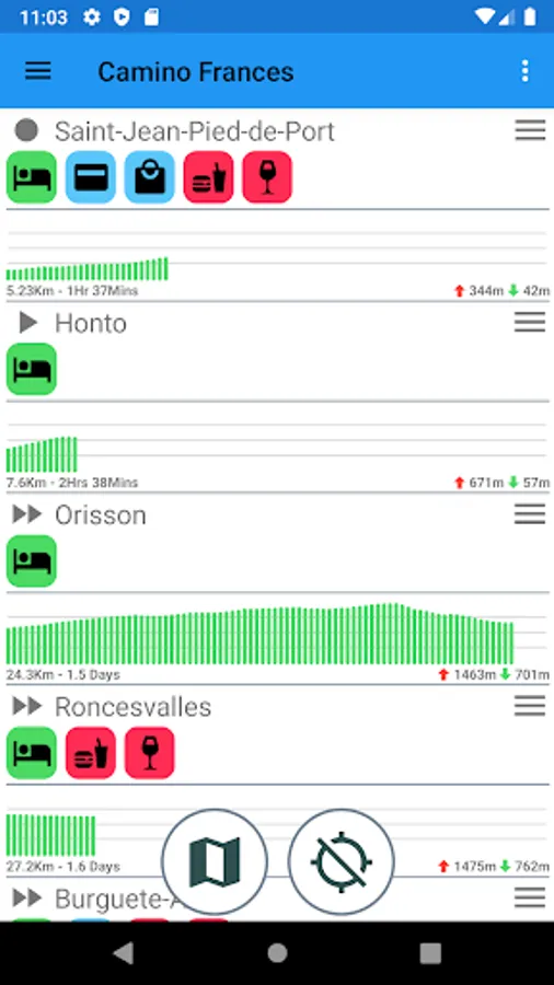 Trailmaker's Camino is an app for planning and completing your journey on the Camino De Santiago. All major and minor stops are listed along with the facilities available at each. It makes it easy to work out where to get lunch and where to stop overnight.