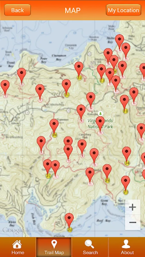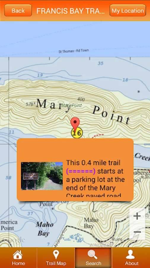 Interactive Trail Map: This map uses the indispensable Trail Bandit Map and includes a “my location” feature to show you your position on the trail. Pins identifying the various trails can be tapped to provide trail information and photos (photos only available while online)