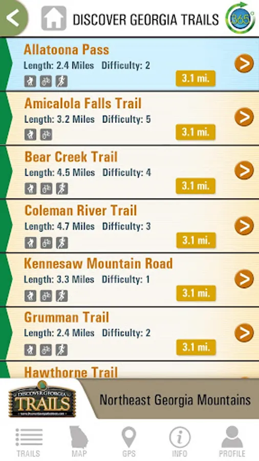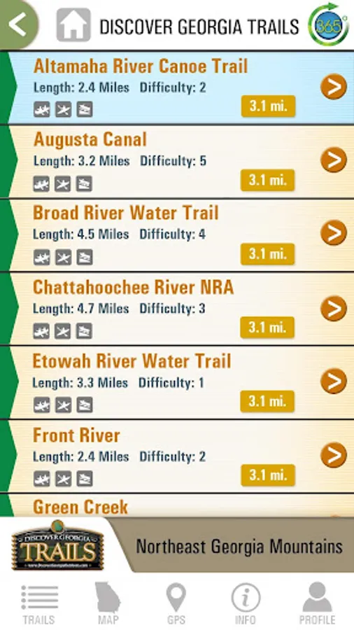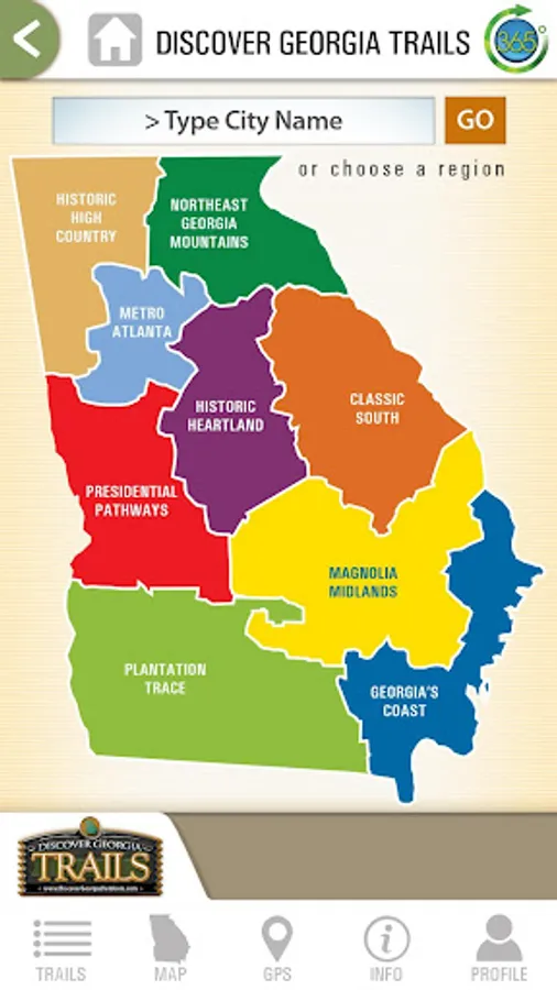 Hit the trail in Georgia with The Discover Georgia Trails Mobile App! Find information on hiking, biking and water trails throughout the state of Georgia. Use the customizable map for turn-by-turn directions to every trail.