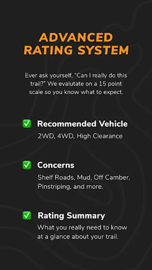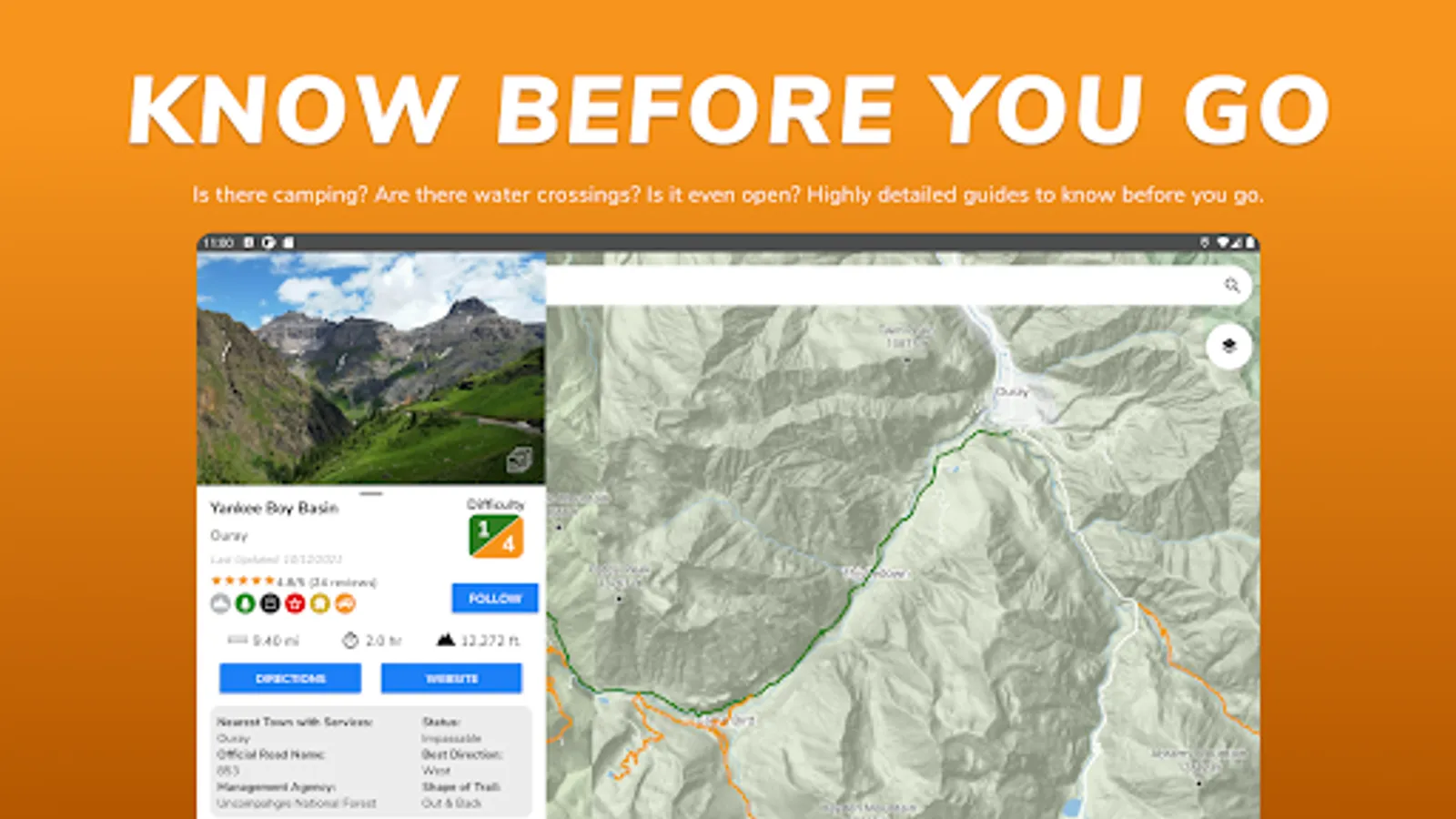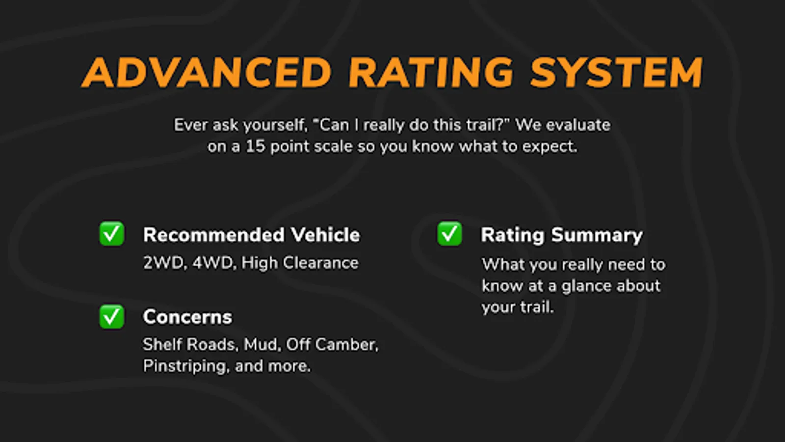 Find your perfect offroad trail and follow them with ease with the easy-to-use Trails Offroad Trail Guide System. Detailed technical ratings, camping, distances, and obstacle information at your fingertips.