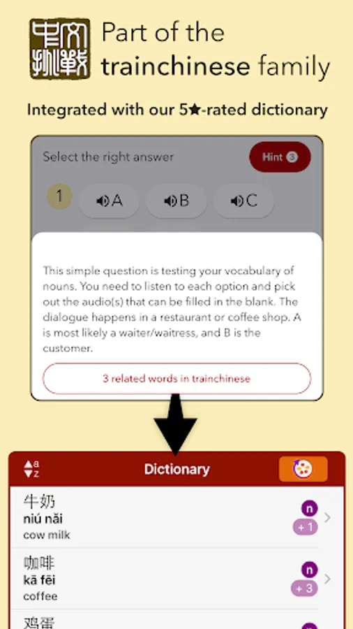 Chinese Challenges works seamlessly with the trainchinese Dictionary and Flash cards app. Most exercises are linked to words in the dictionary, and you can get there in just a tap.