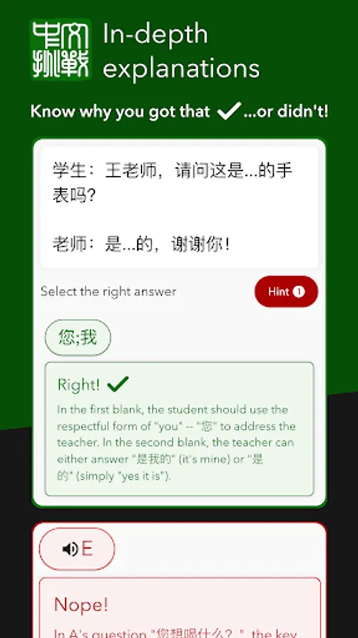 Plenty of apps can throw questions at you, but rarely is there any context. Rather than forcing you to guess why your answers were right or wrong, Chinese Challenges features detailed explanations written by our native-speaker experts.