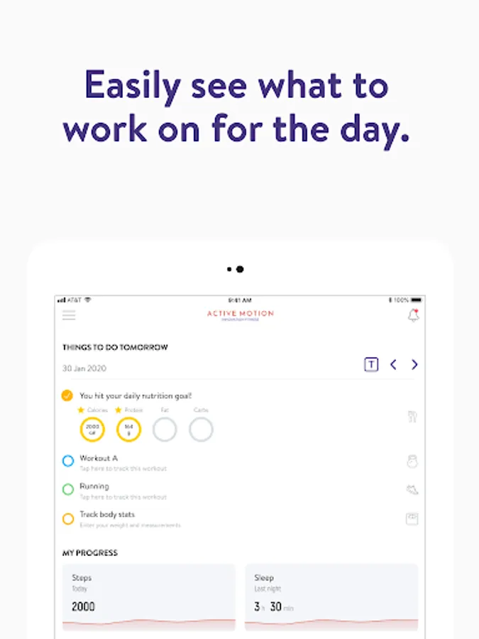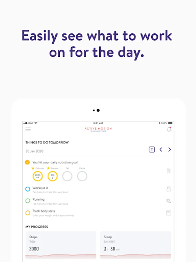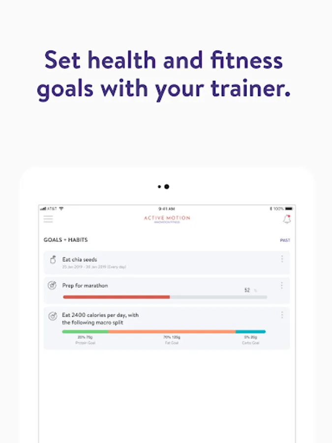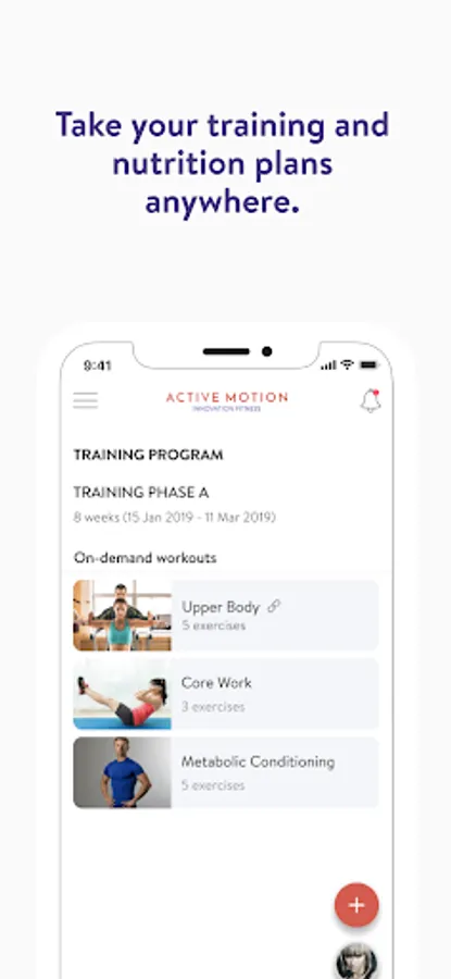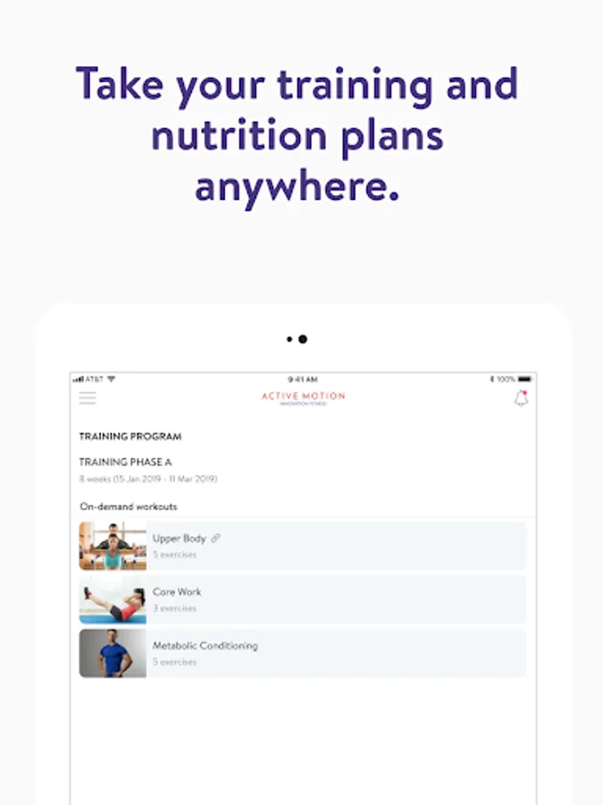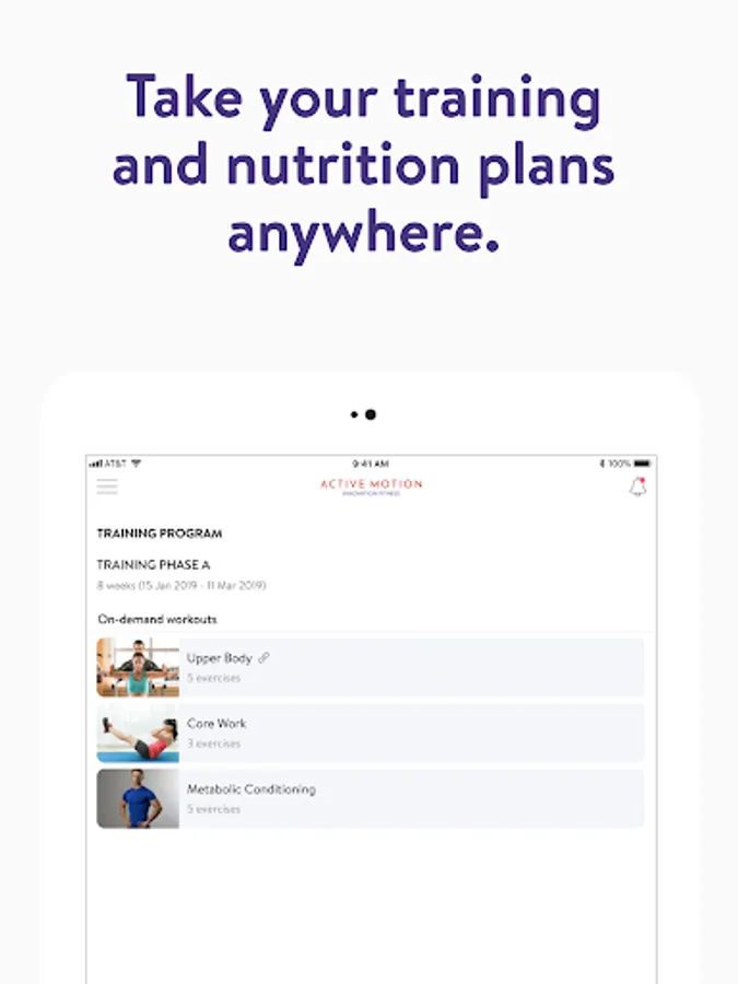 Με την εφαρμογή Active Motion, θα έχετε πρόσβαση σε προγράμματα προπόνησης που έχουν σχεδιαστεί ειδικά για να σας βοηθήσουν να επιτύχετε τους στόχους φυσικής κατάστασης και υγείας σας! Μπορείτε να παρακολουθείτε και να παρακολουθείτε τις προπονήσεις σας, τη διατροφή σας, τις συνήθειες του τρόπου ζωής σας, τις μετρήσεις και τα αποτελέσματα – όλα με τη βοήθεια του προπονητή σας.