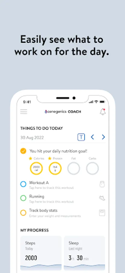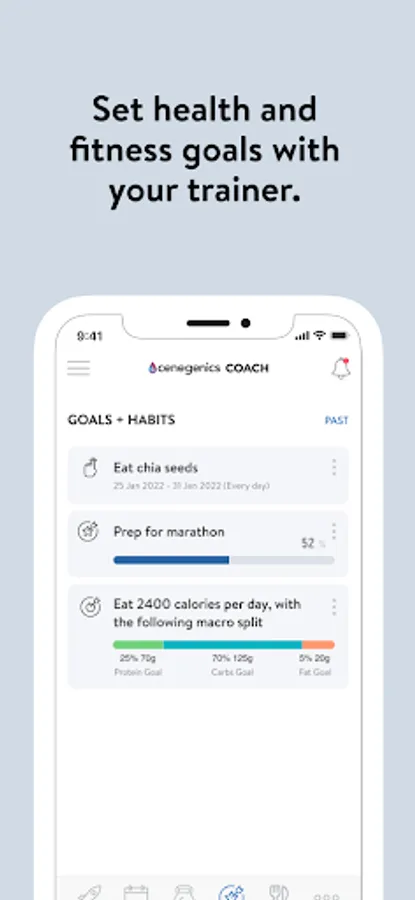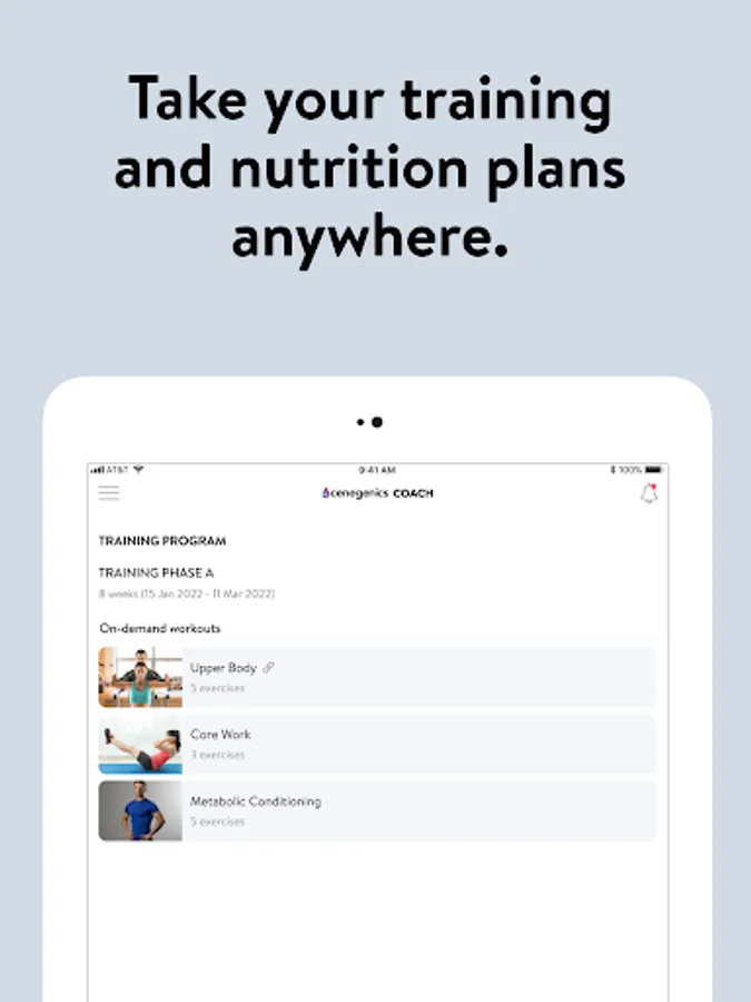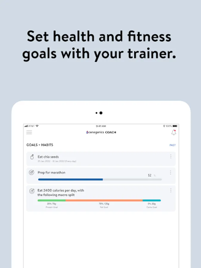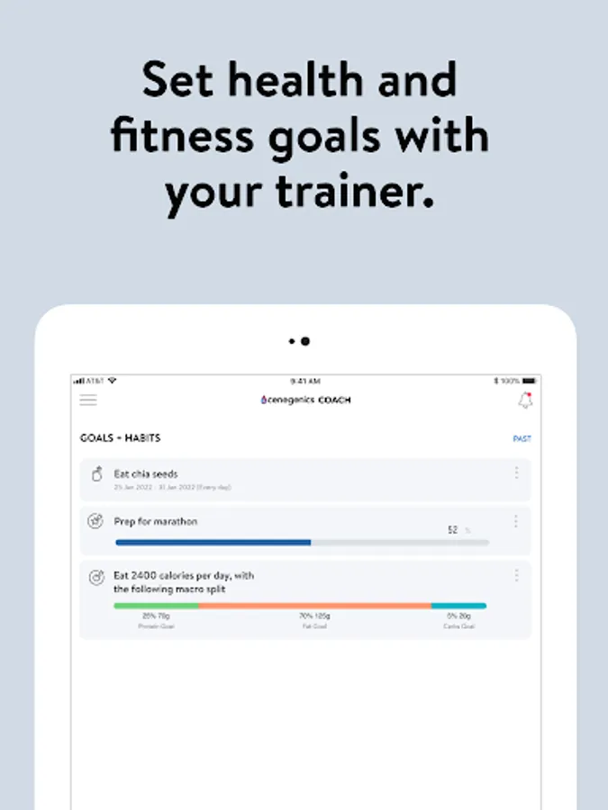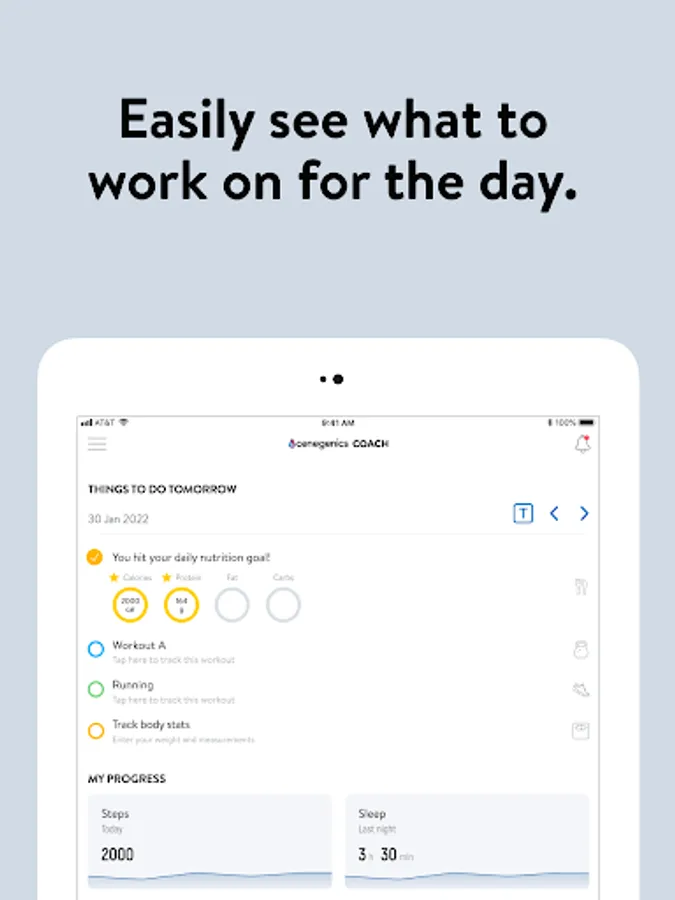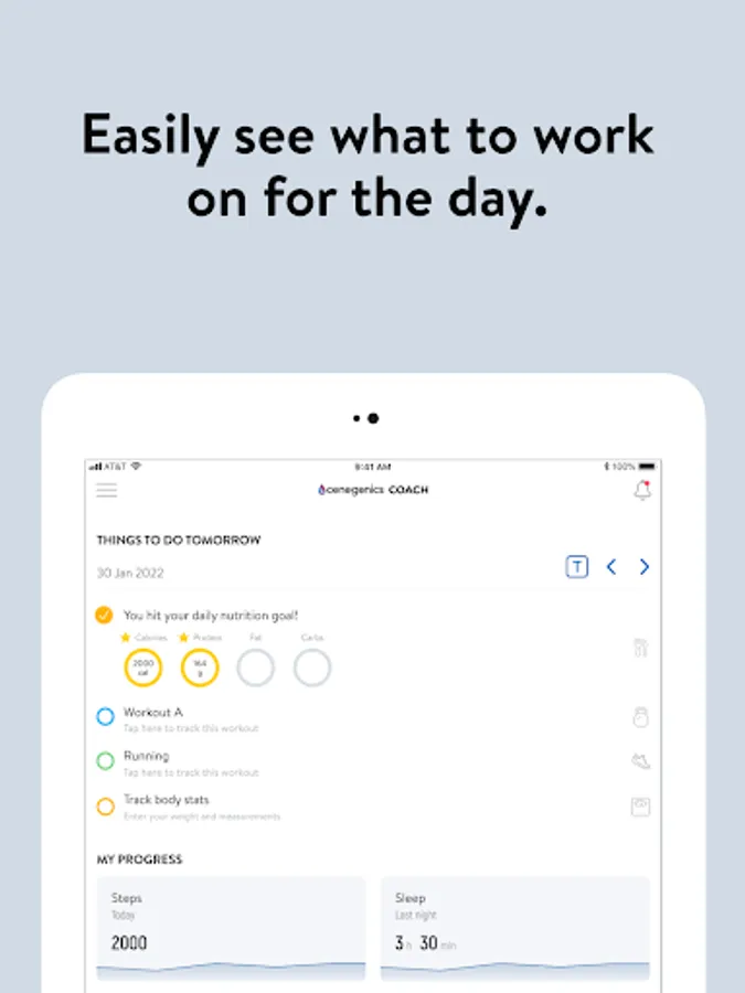With Cenegenics Coach, you can start tracking your workouts and meals, measuring results and achieving your fitness goals, all with the help of your Performance Health Coach.