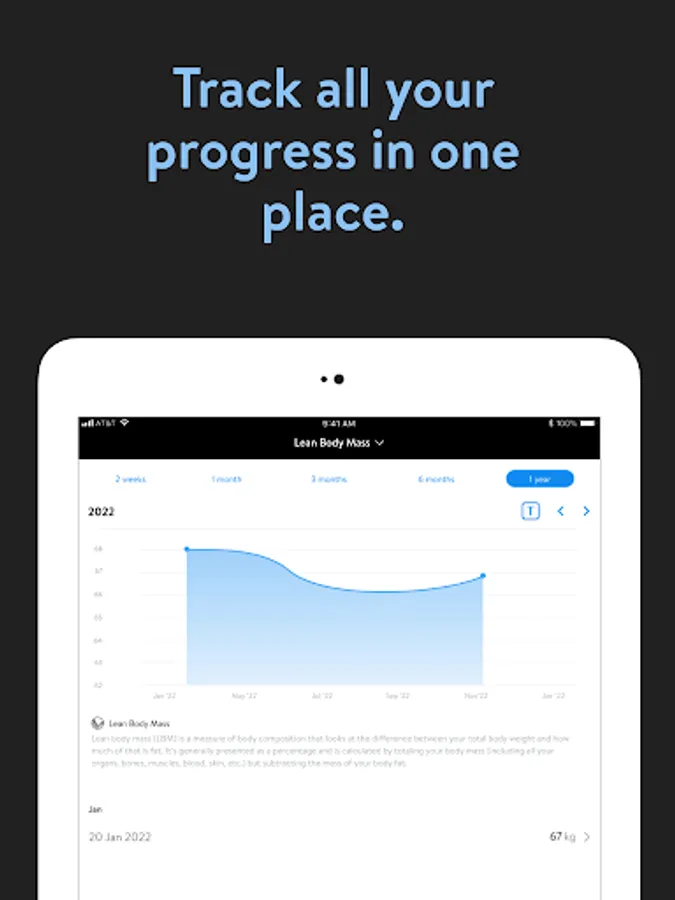 - Connect to other wearable devices and apps like the Apple Health App, Garmin, Fitbit, MyFitnessPal, and Withings devices to track workouts, sleep, nutrition, and body stats and composition