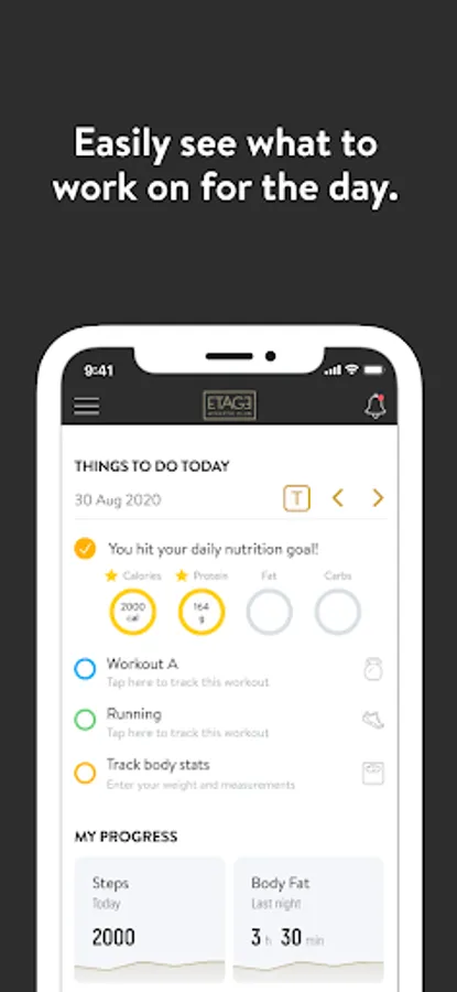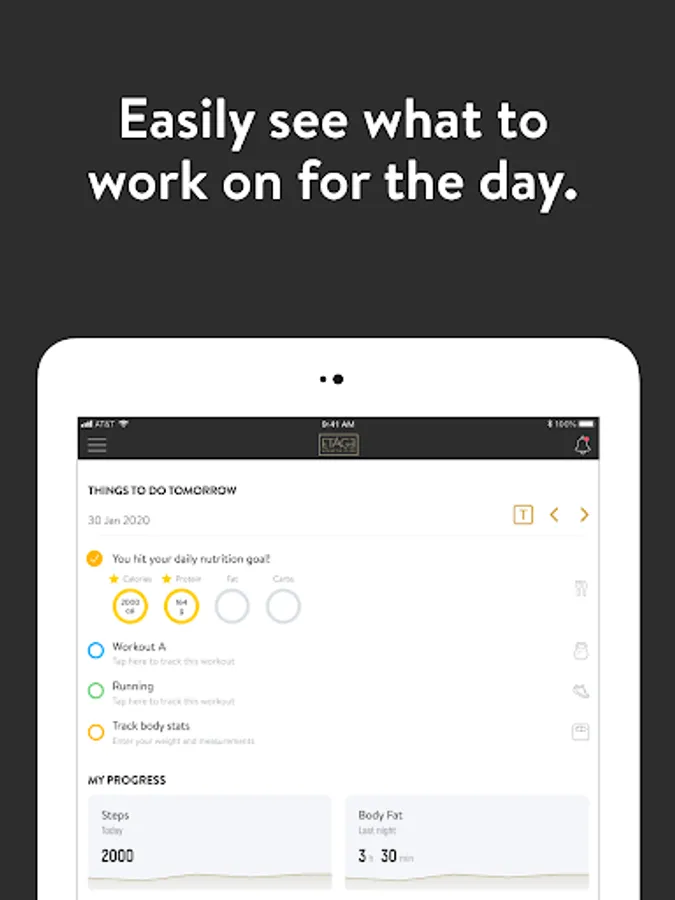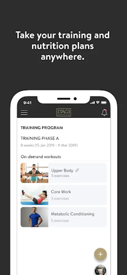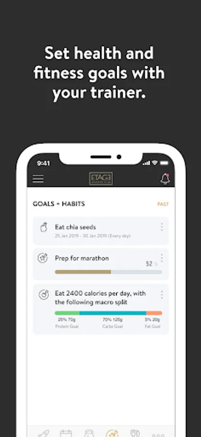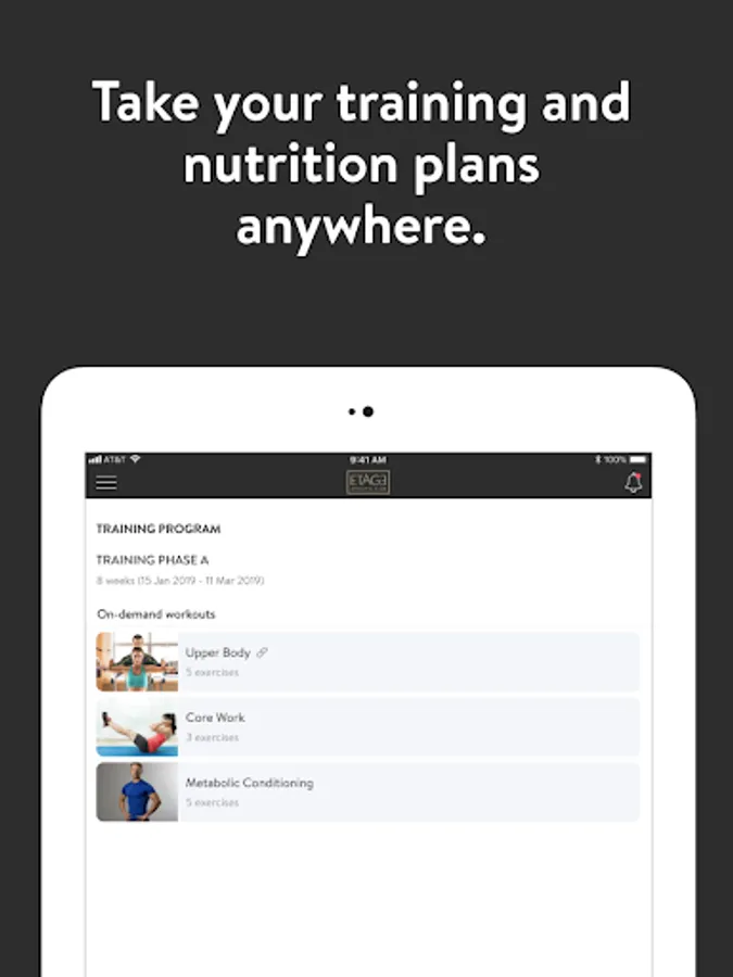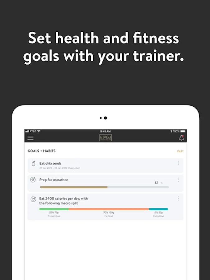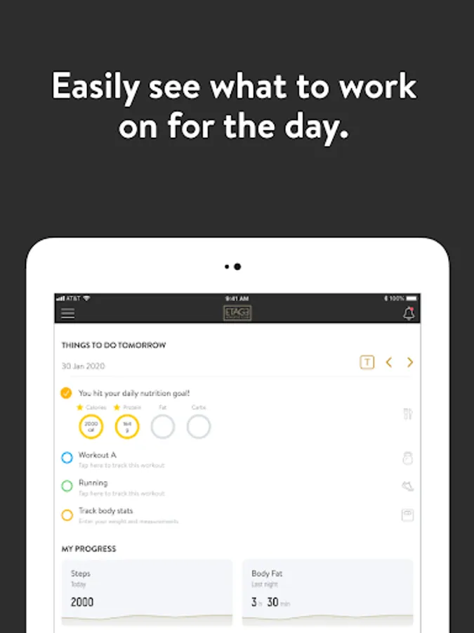 With the Etage Athletic Club App, you can start tracking your workouts and meals, measuring results, and achieving your fitness goals, all with the help of your personal trainer.