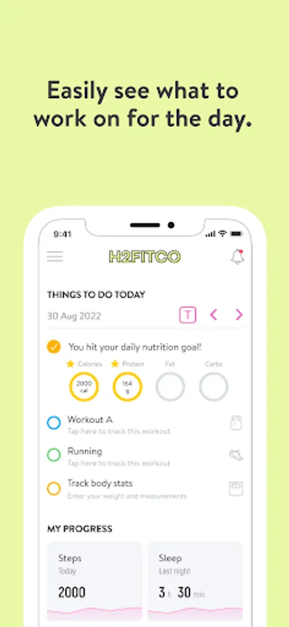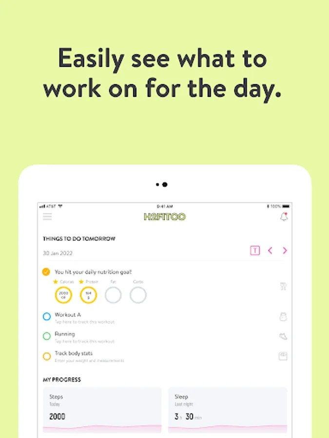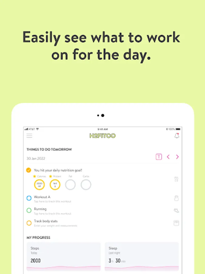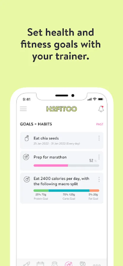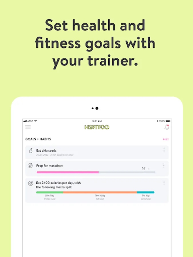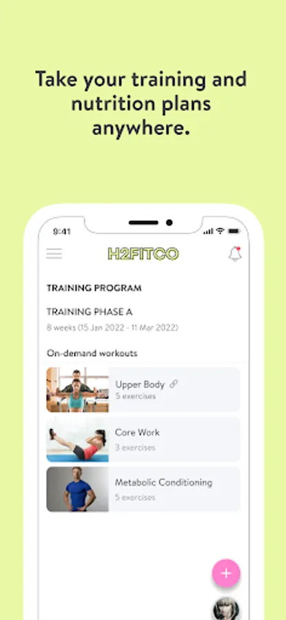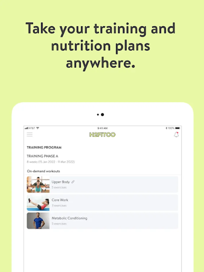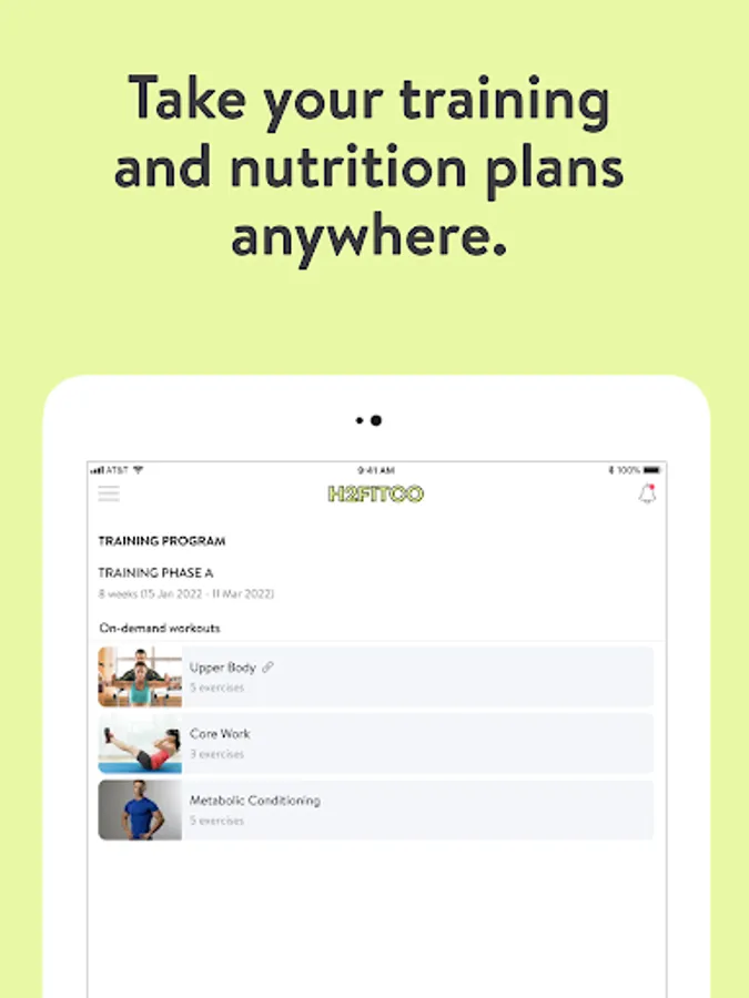 With the H2FITCO App, you will have access to workout programs designed specifically to help you reach your fitness, health & wellness goals! Includes follow along workouts, gym & home workouts, nutrition programs, recipes, ability to track your lifestyle habits, measurements and results–all with the help of your coach.