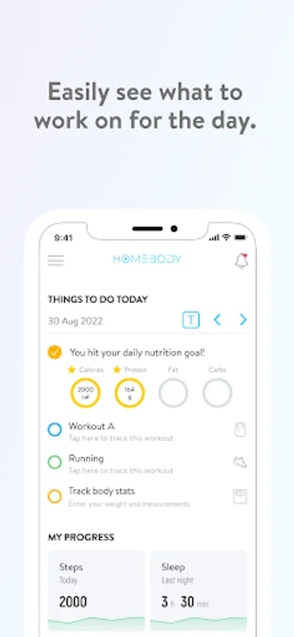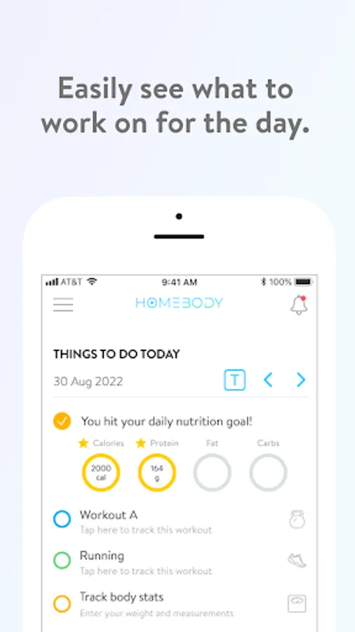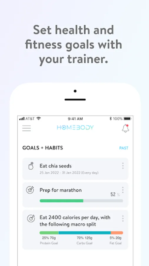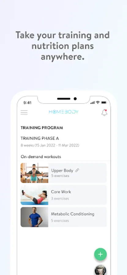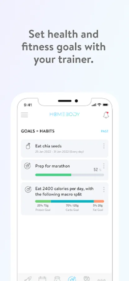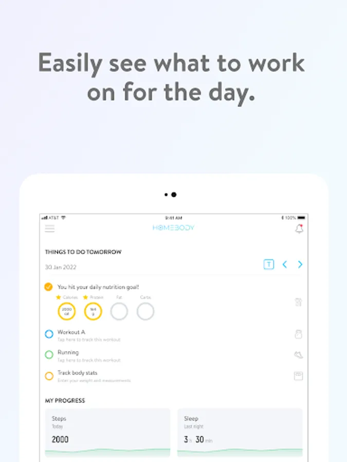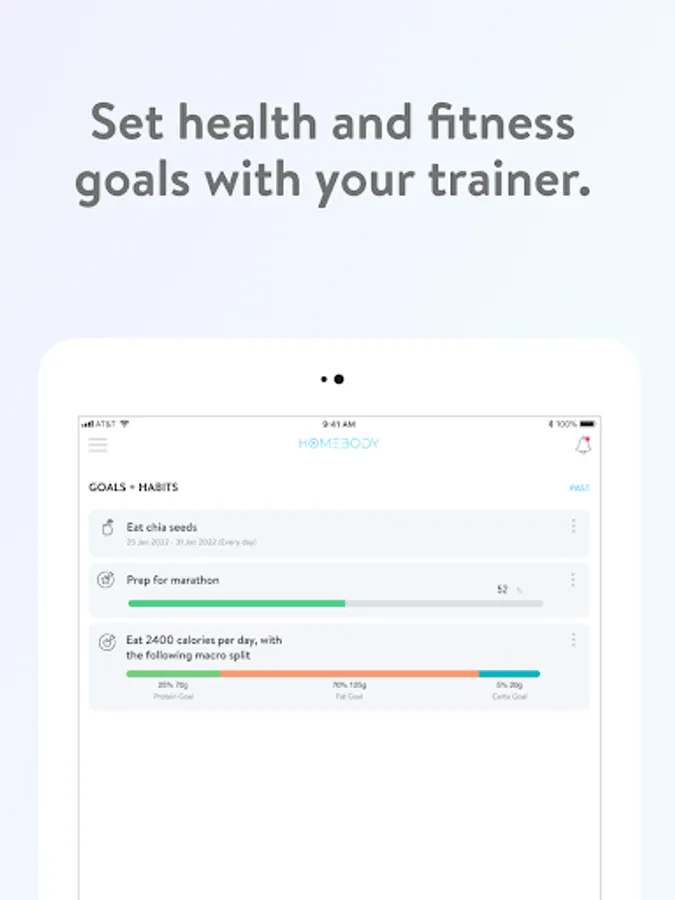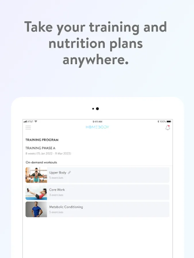 With the HOMEBODY App, you will have access to workout programs designed specifically to help you reach your fitness and health goals! You can follow & track your workouts, your nutrition, your lifestyle habits, measurements and results–all with the help of your coach.