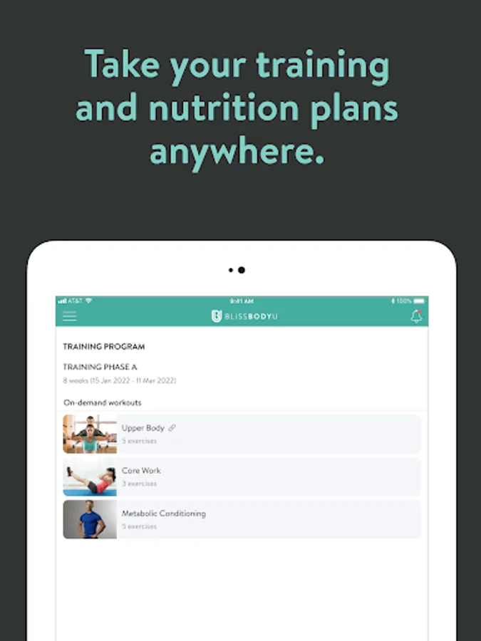 With the BlissBodyU App, you will have access to workout programs designed specifically to help you reach your fitness and health goals! You can follow & track your workouts, your nutrition, your lifestyle habits, measurements and results–all with the help of your coach.