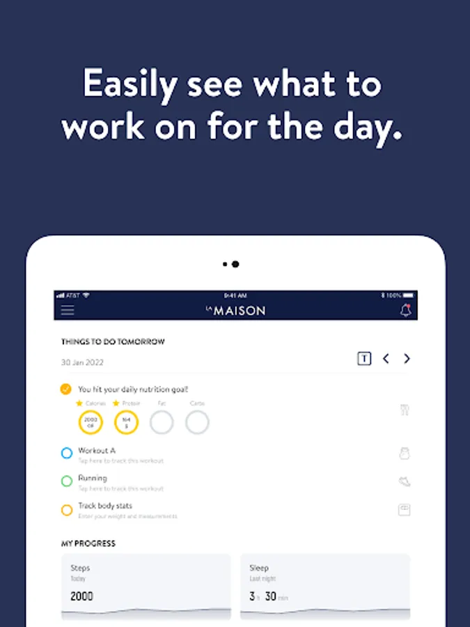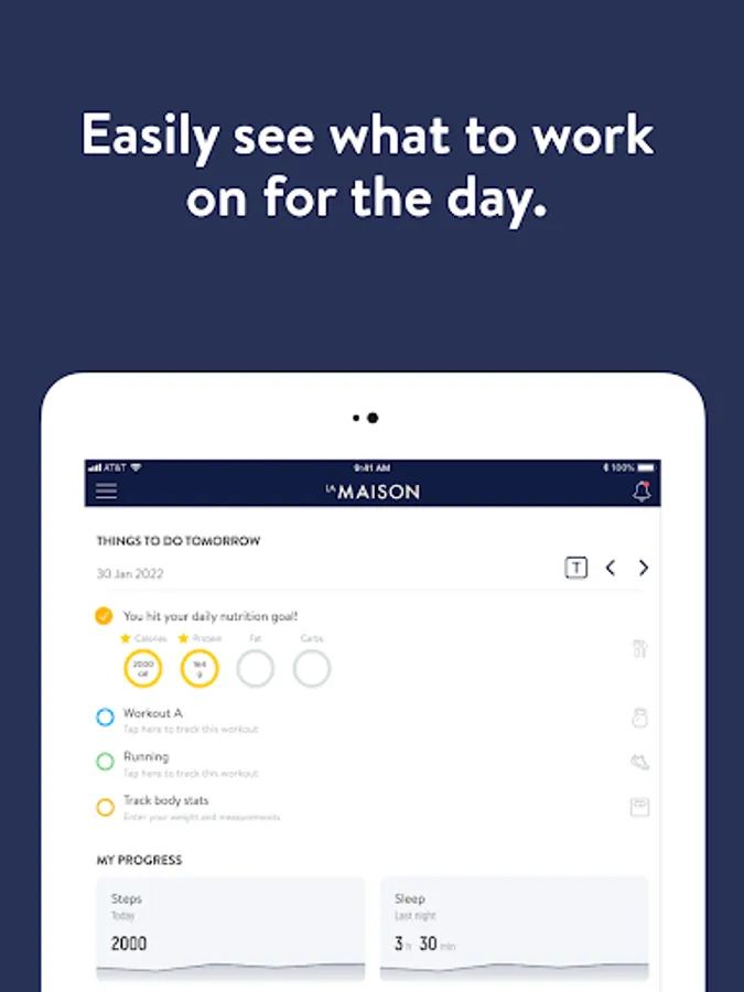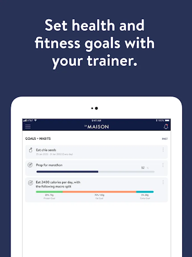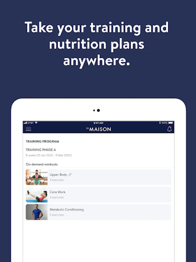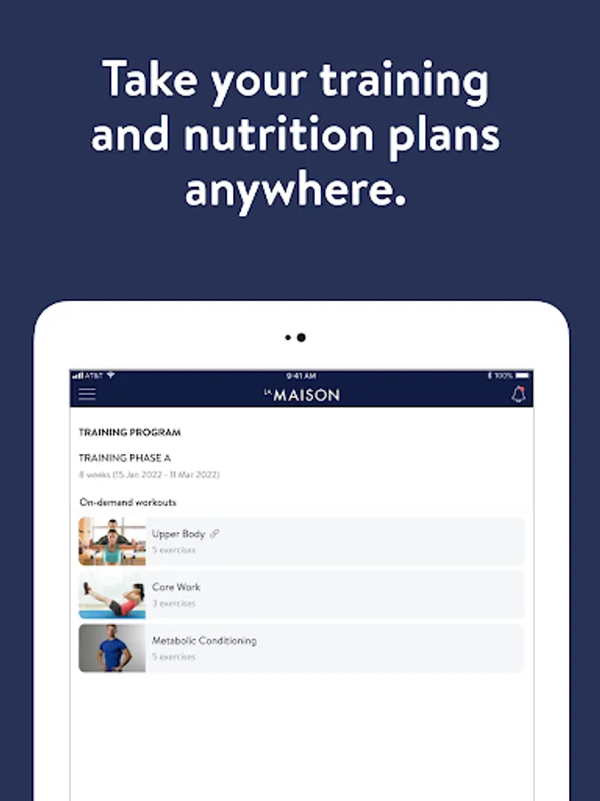 With the La Maison Personal Training App, you will have access to workout programs designed specifically to help you reach your fitness and health goals! You can follow & track your workouts, your nutrition, your lifestyle habits, measurements and results–all with the help of your coach.