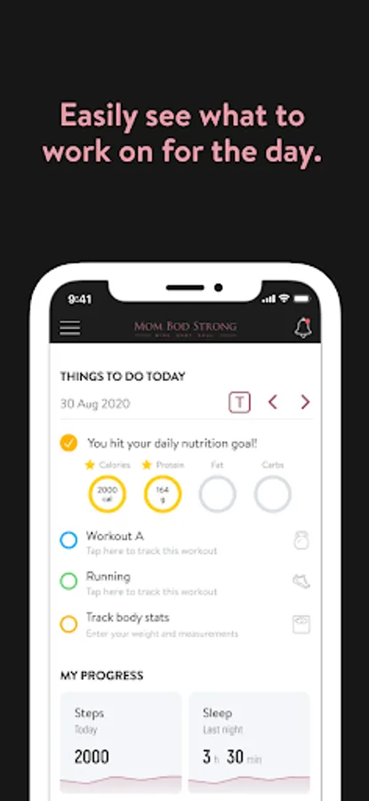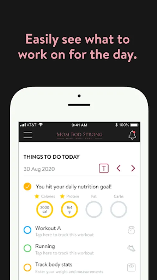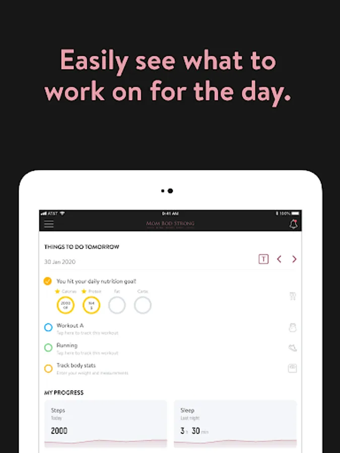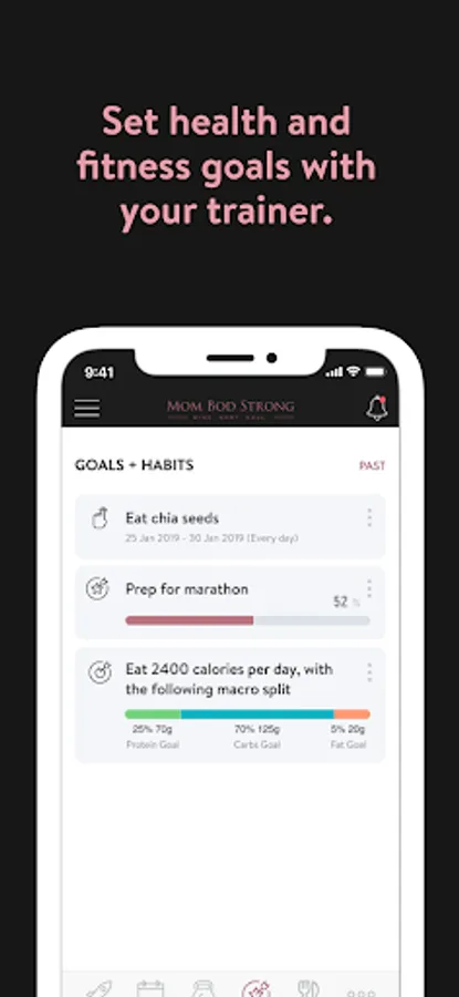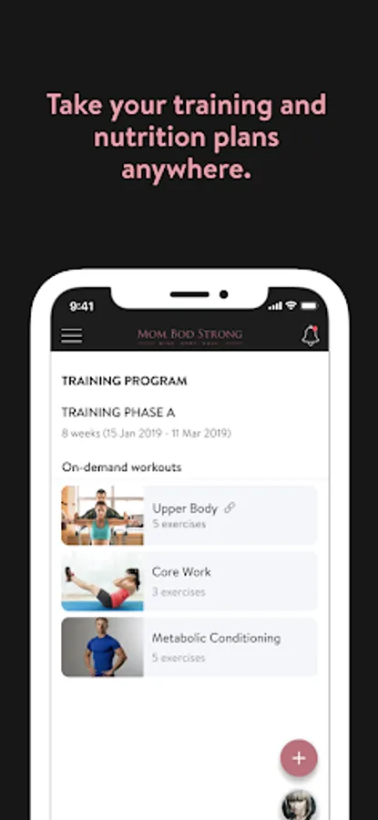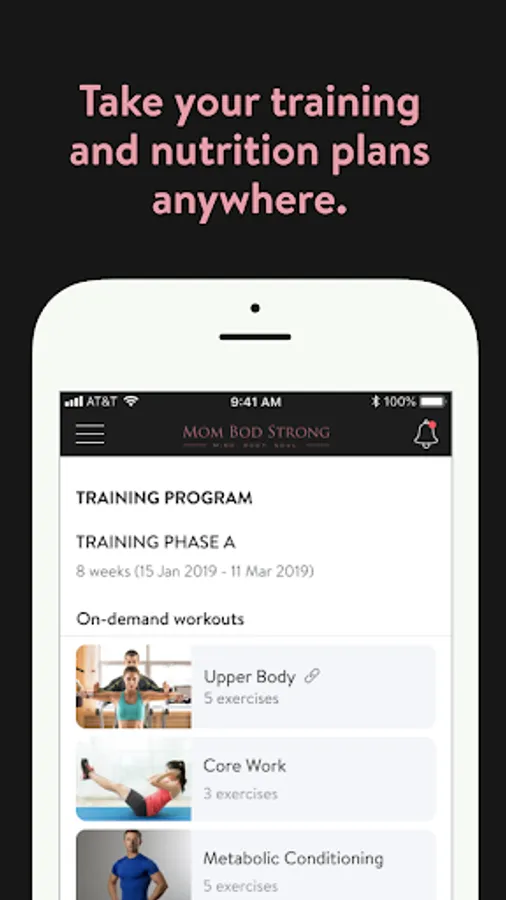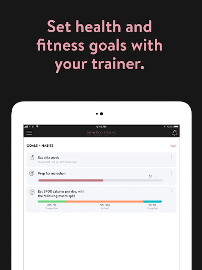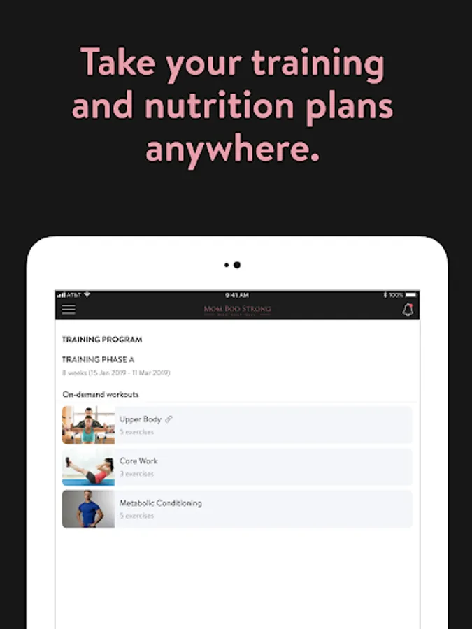 With the Mom Bod Strong App, you will have access to workout programs designed specifically to help you reach your fitness and health goals! You can follow & track your workouts, your nutrition, your lifestyle habits, measurements and results–all with the help of your coach.