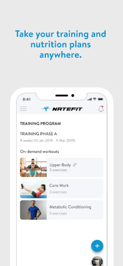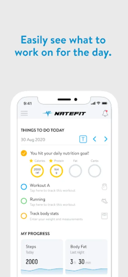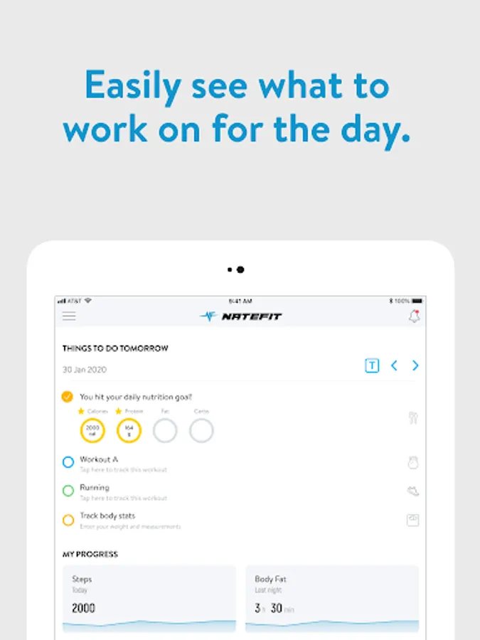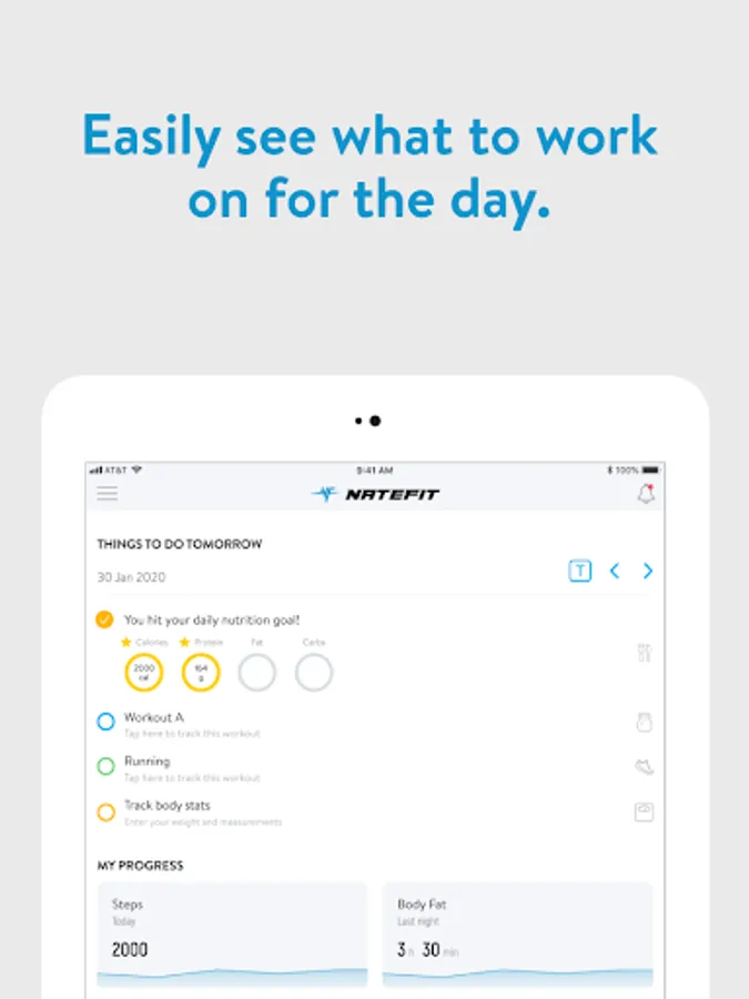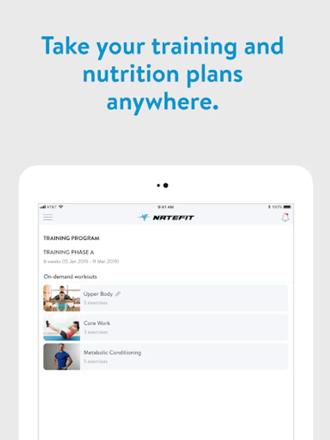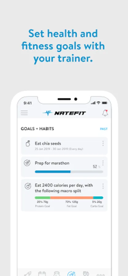 With the NATEFIT App, you can start tracking your workouts and meals, measuring results, and achieving your fitness goals, all with the help of your personal trainer.