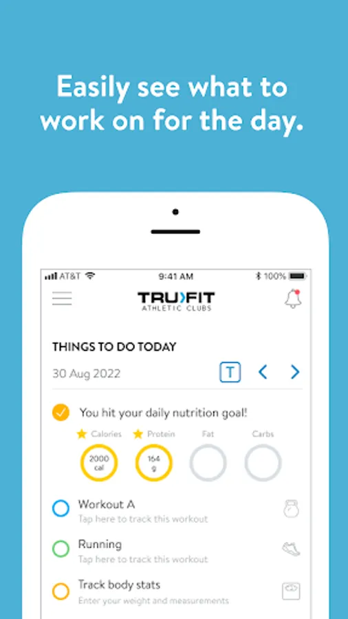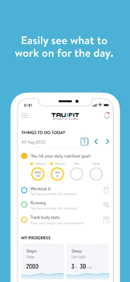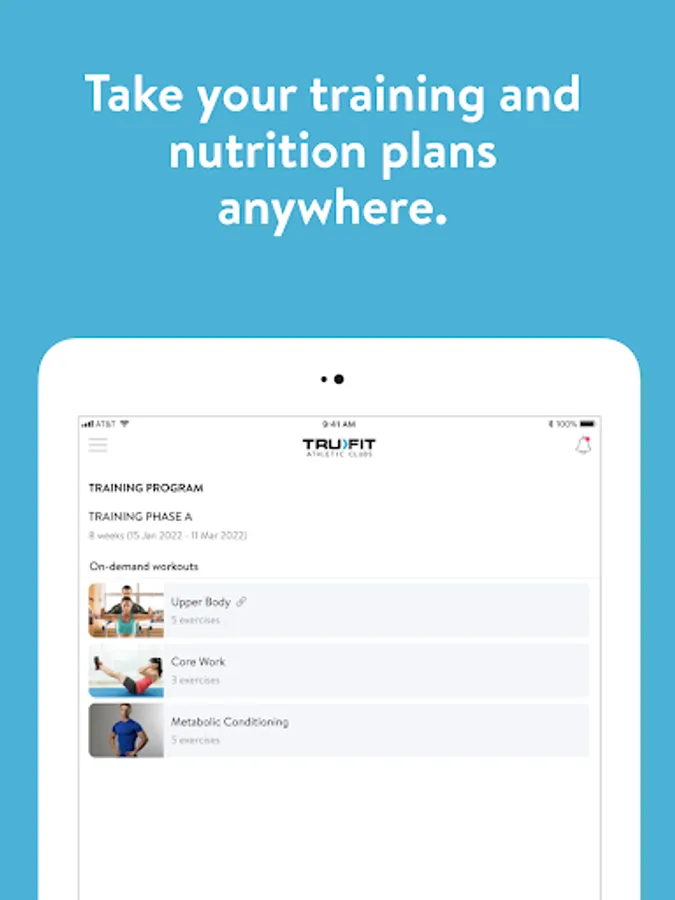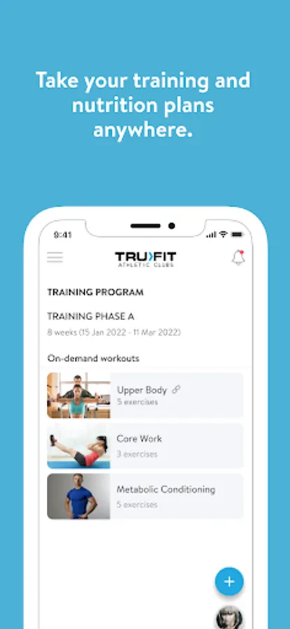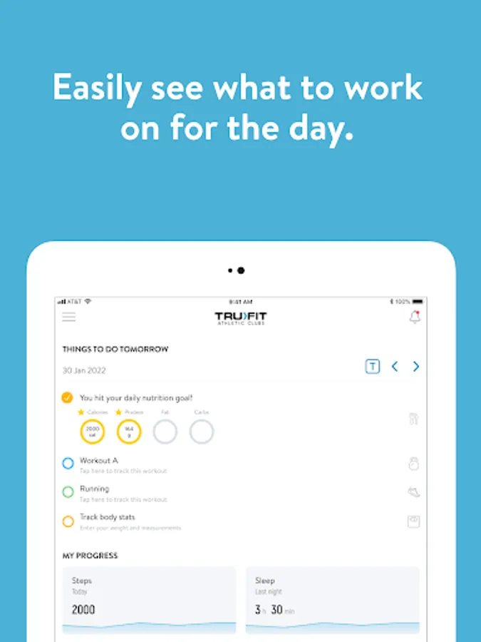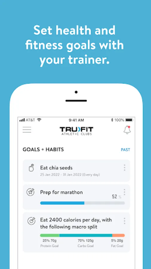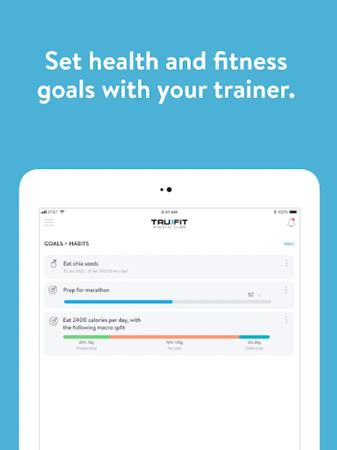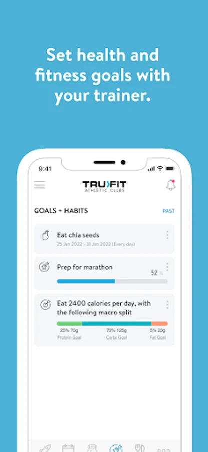 With the TruFit Athletic Club App, you can start tracking your workouts and meals, measuring results, and achieving your fitness goals, all with the help of your personal trainer.