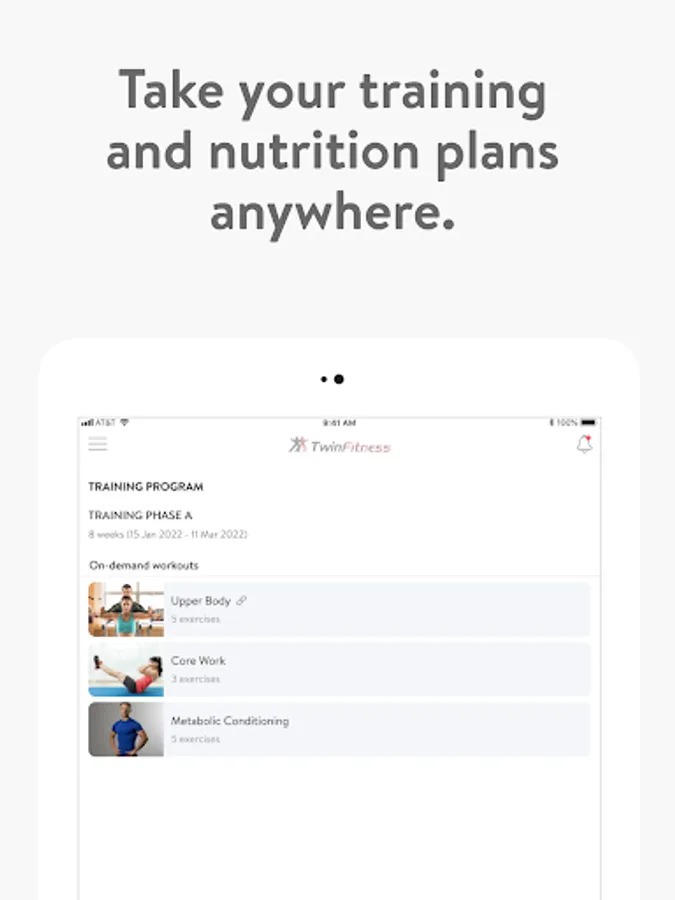 With the TwinFitness App, you will have access to workout programs designed specifically to help you reach your fitness and health goals! You can follow & track your workouts, your nutrition, your lifestyle habits, measurements and results–all with the help of your coach.