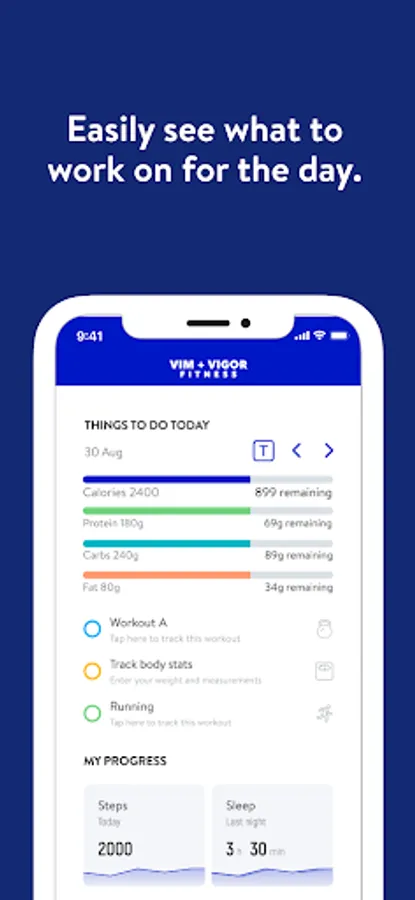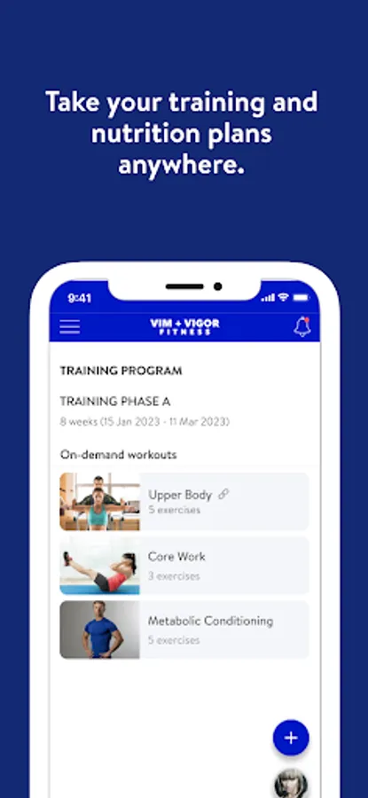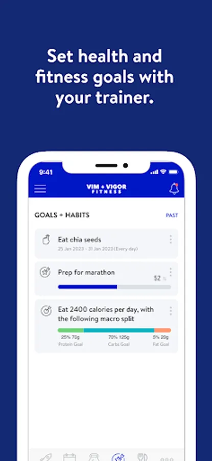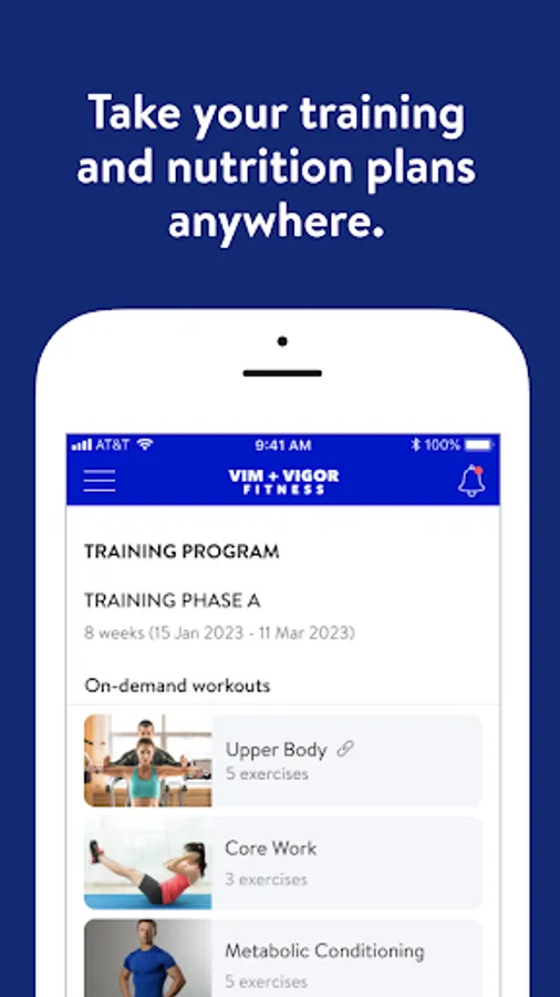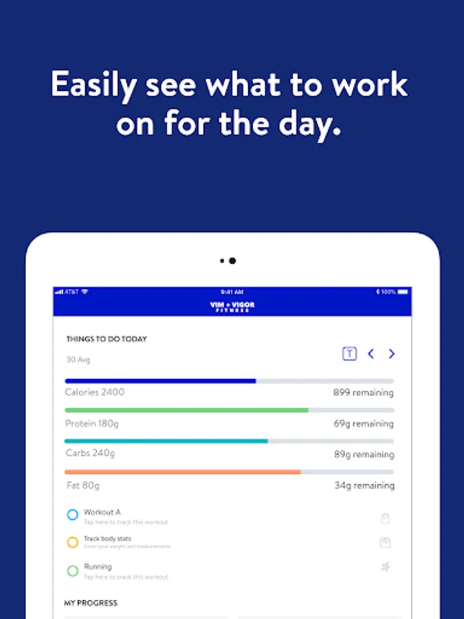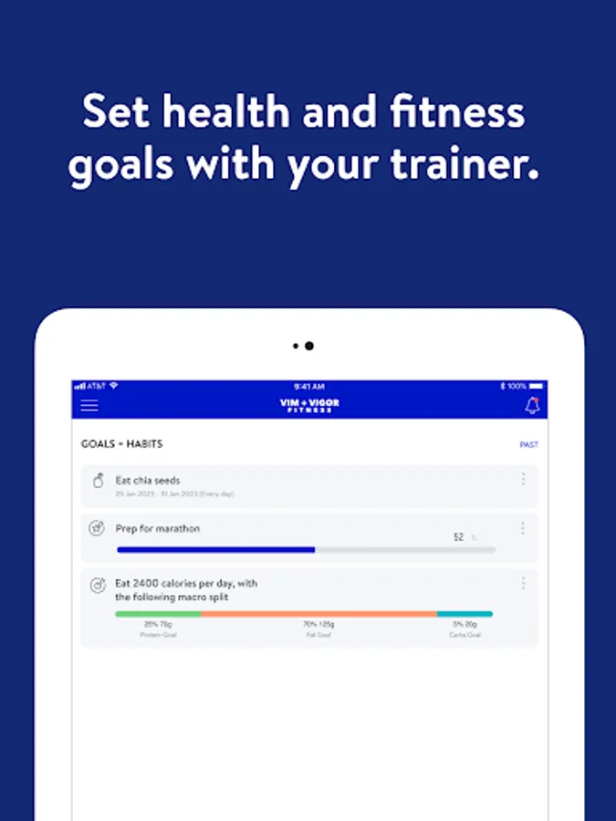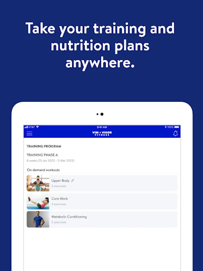 With the Vim and Vigor App, you can start tracking your workouts and meals, measuring results, and achieving your fitness goals, all with the help of your personal trainer.
