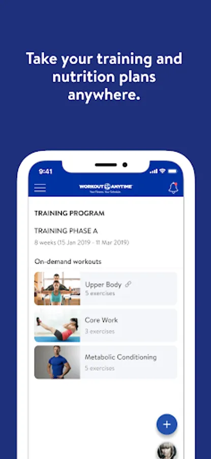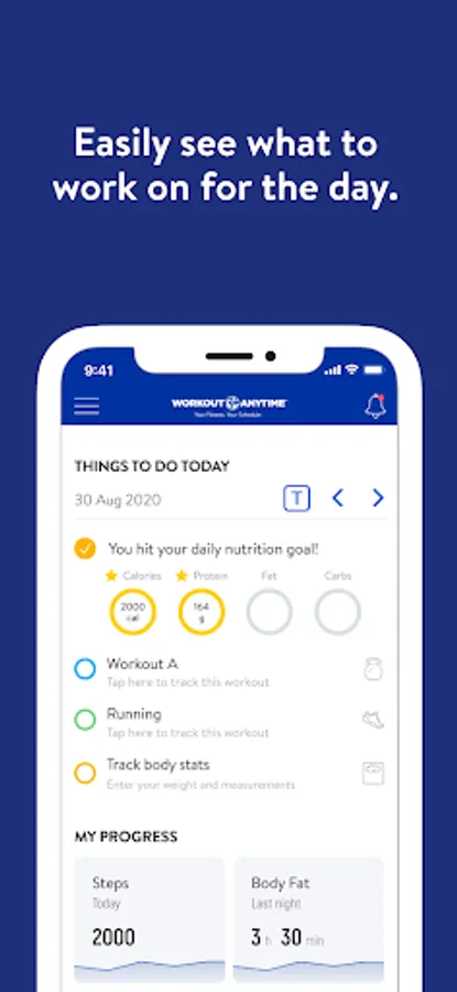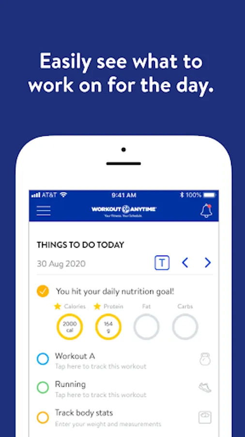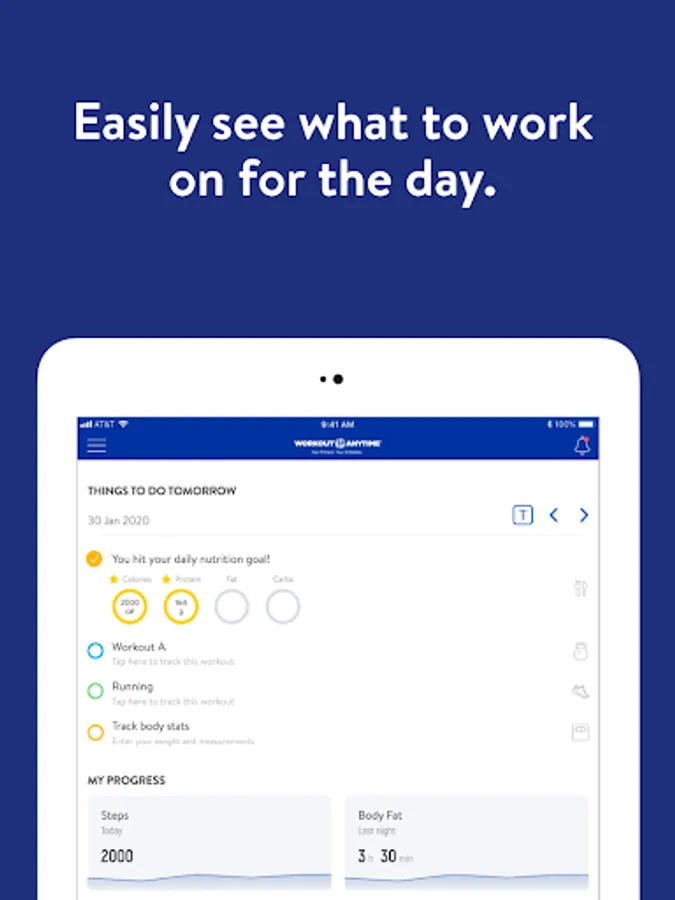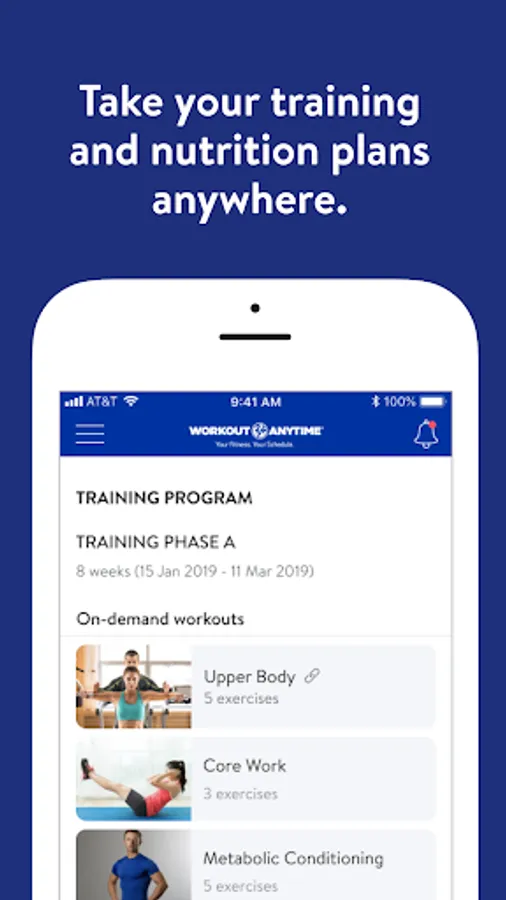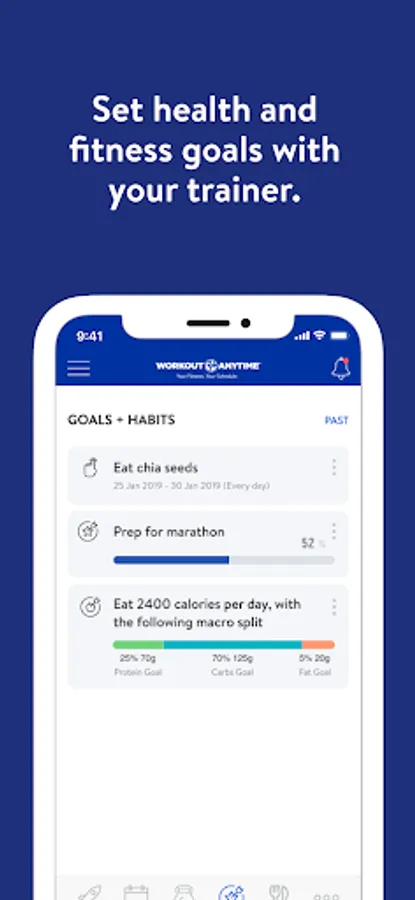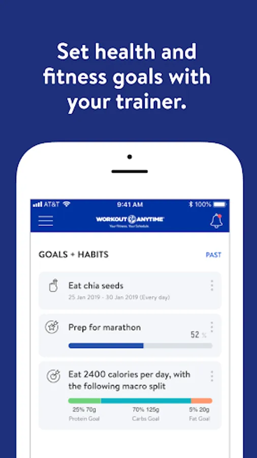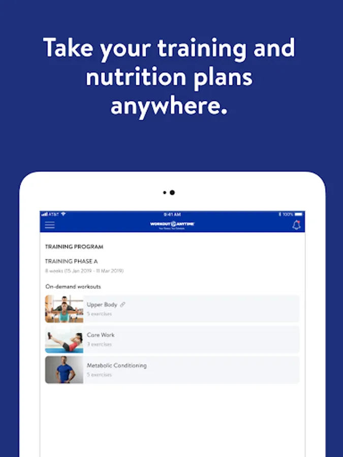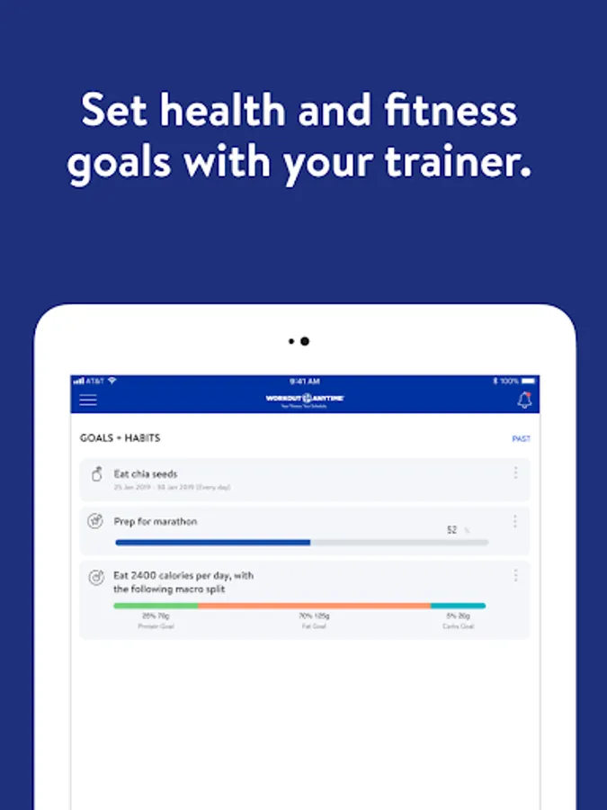 With the Workout Anytime Go App, you can start tracking your workouts and meals, measuring results, and achieving your fitness goals, all with the help of your personal trainer.