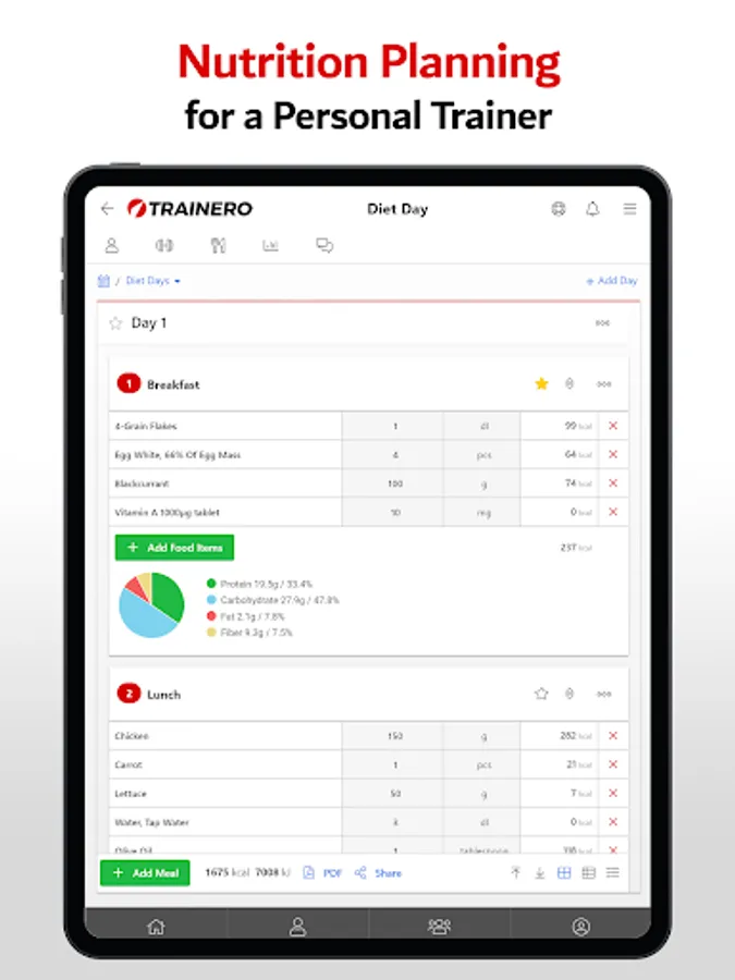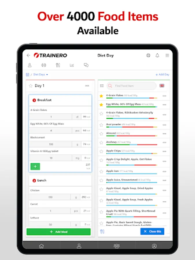 Build detailed diet plans by using over 4000 food items. Tag your favorites and save meals for reuse.