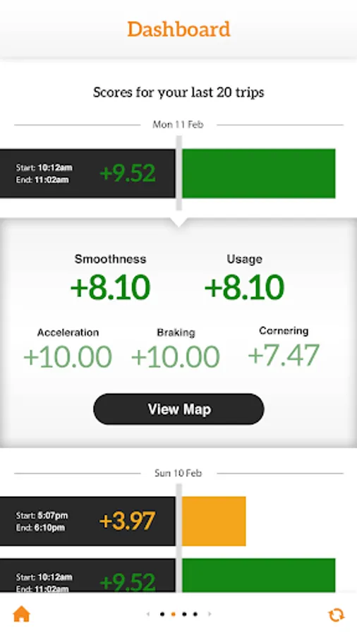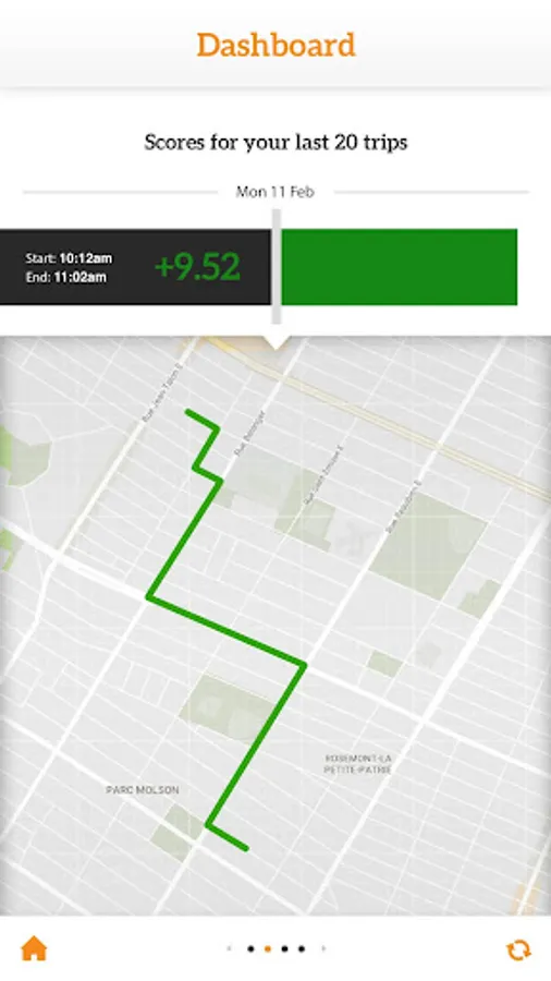 • Monitor and self-regulate your driving behaviour. View overall scoring, scores for your last 20 trips, changes in scoring week over week, and a breakdown of scores for each individual trip by speed, smoothness, and usage.