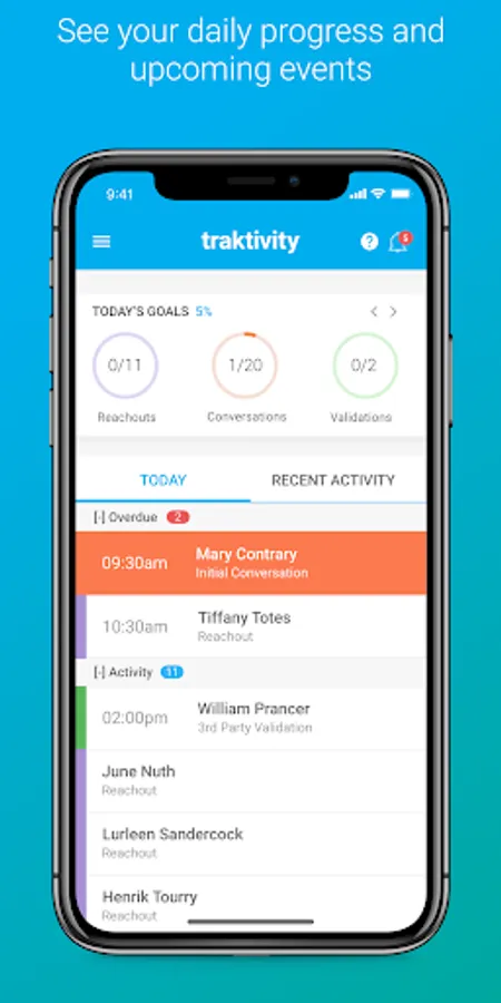 View your progress toward daily and weekly goals, see your history, sort, and search by customer, and handle your to-do list from the easy-to-use Traktivity dashboard.
