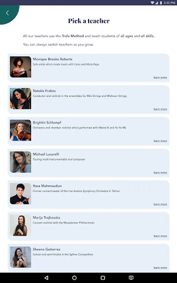 Trala’s mission is to make world-class music education available to every single person on Earth. We’re here to give you the lessons, feedback, and support you need to become a violinist. Over 400,000 students from 193+ countries have downloaded Trala to learn violin.