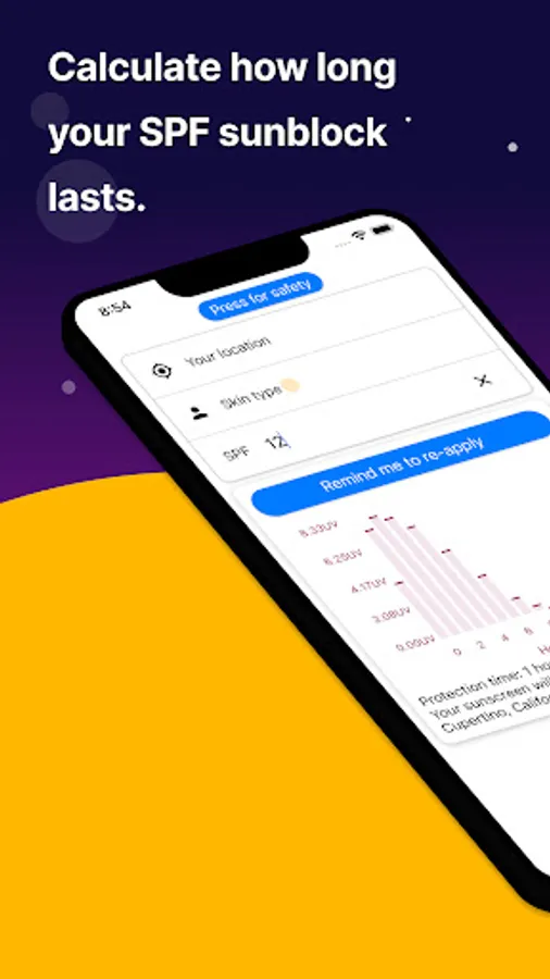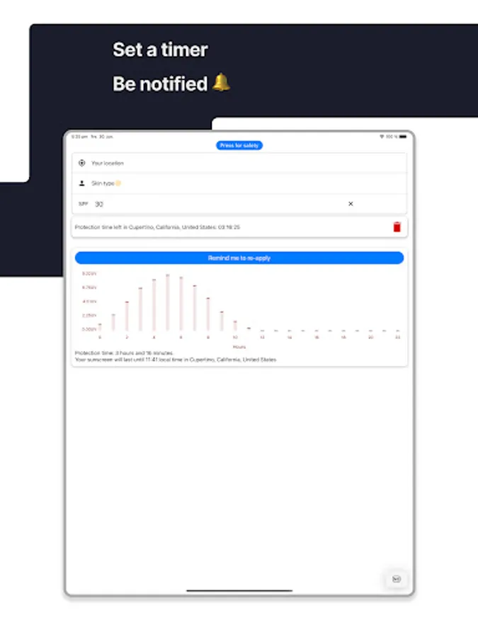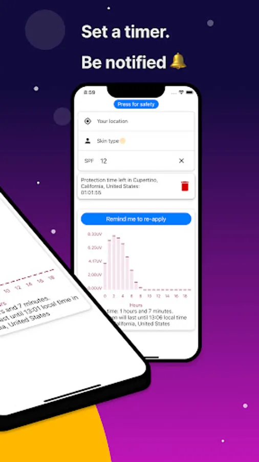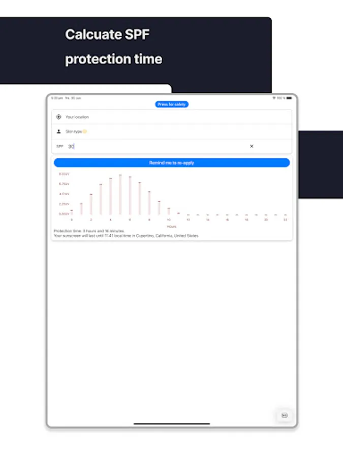 SPF timer uses UV data from chosen location and your skin type to determine how long the protection lasts.
