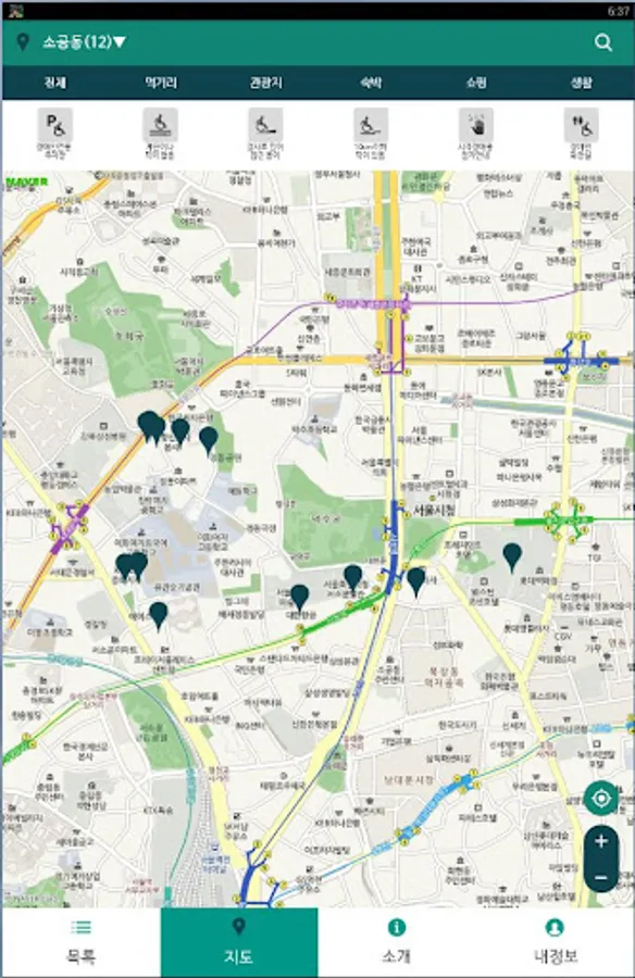 - 줌 인/아웃 버튼 : 손이 불편한 장애인을 위한 지도 축소/확대 버튼.