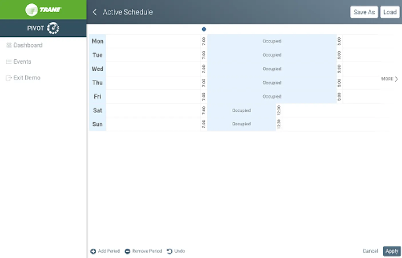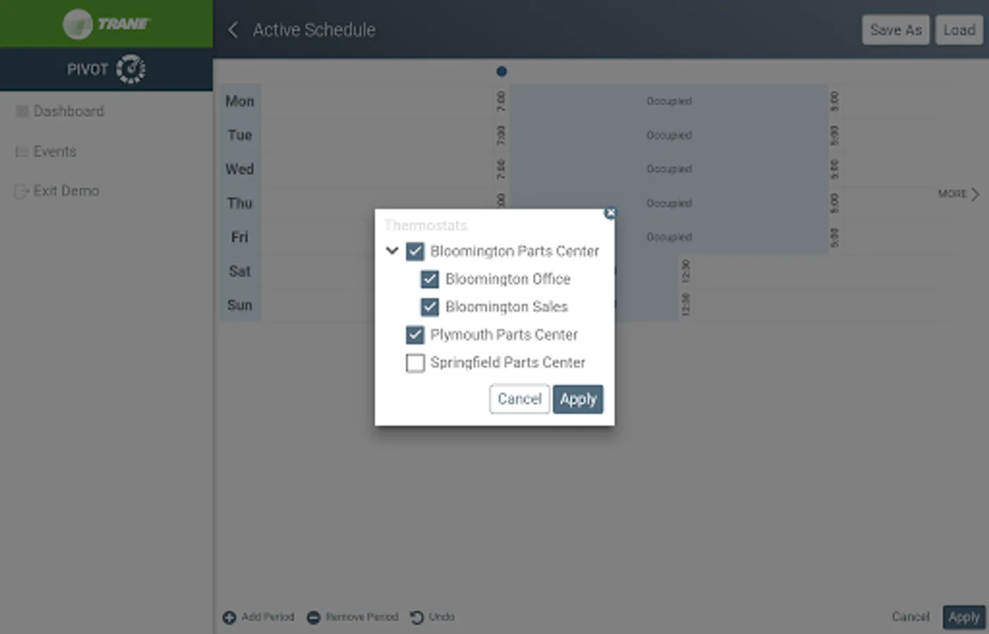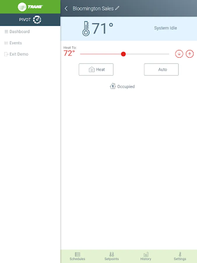 The Trane® Pivot™ Mobile App lets you manage your Pivot™ Smart Thermostats.