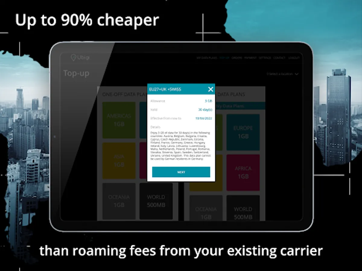 The app is a global provider of premium cellular connectivity services. Ubigi offers immediate access and connection to the Internet through a wide range of cost-effective mobile data plans for smartphones, tablets and laptops, as well as connected vehicles, worldwide.