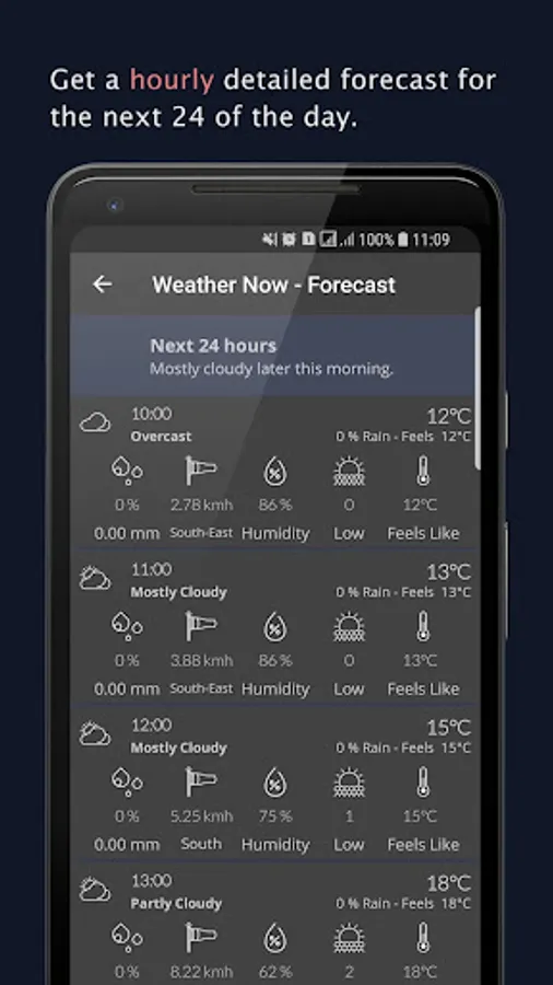 - View important information like actual temperature, visibility, humidity, air pressure, dew point, wind-speed and wind direction.