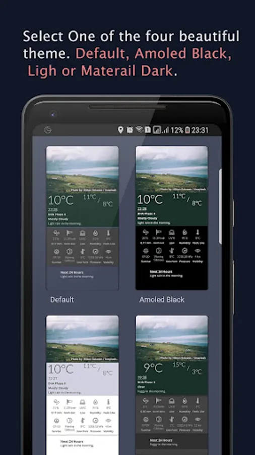 - Choose from four of our beautiful themes. Default, Amoled Black, Light and Material Dark them.
