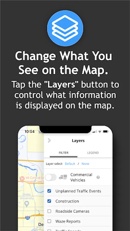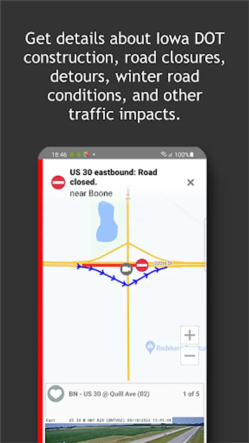 • A zoom-enabled map with tappable traffic event icons and surrounding camera views