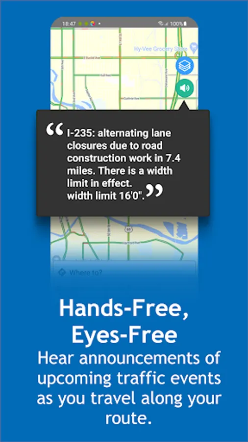 • Hands-free, eyes-free audio announcements of upcoming traffic events as you travel along your route