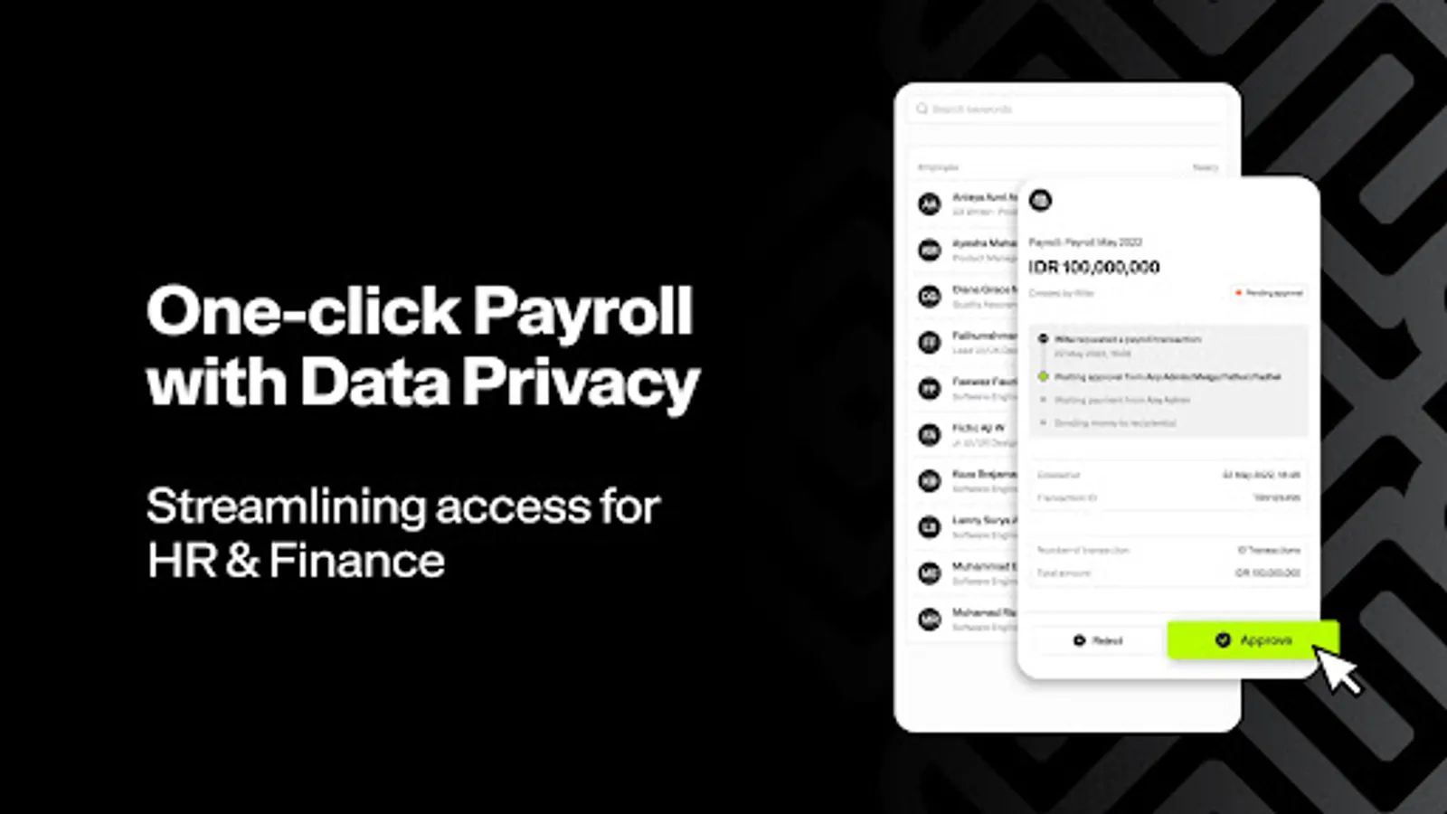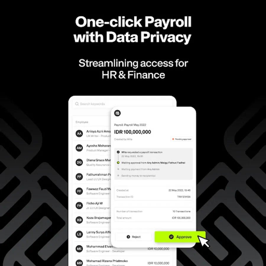 - One-click payroll with data privacy that streamlines Access for HR & Finance