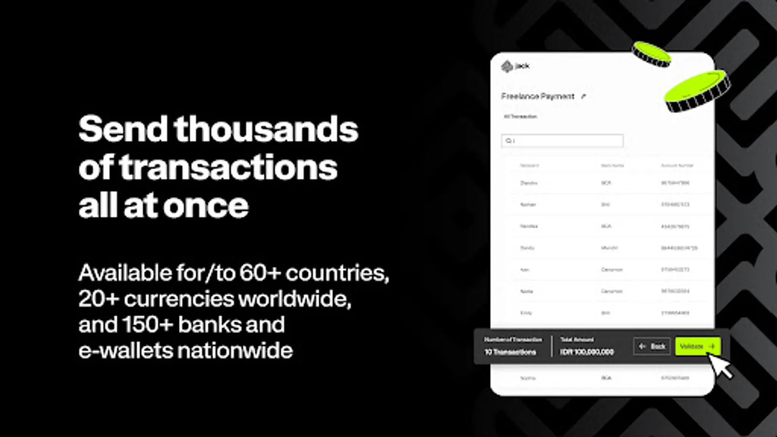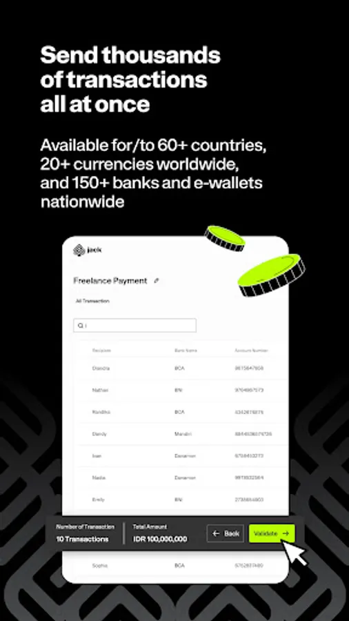 - Send thousands of transactions to over 150 banks & e-wallets in Indonesia