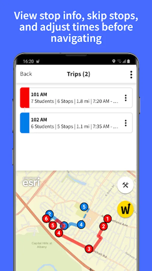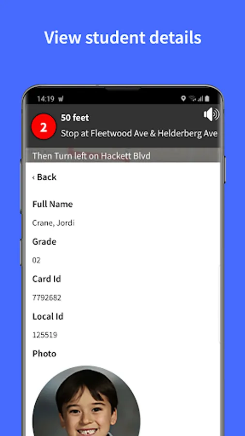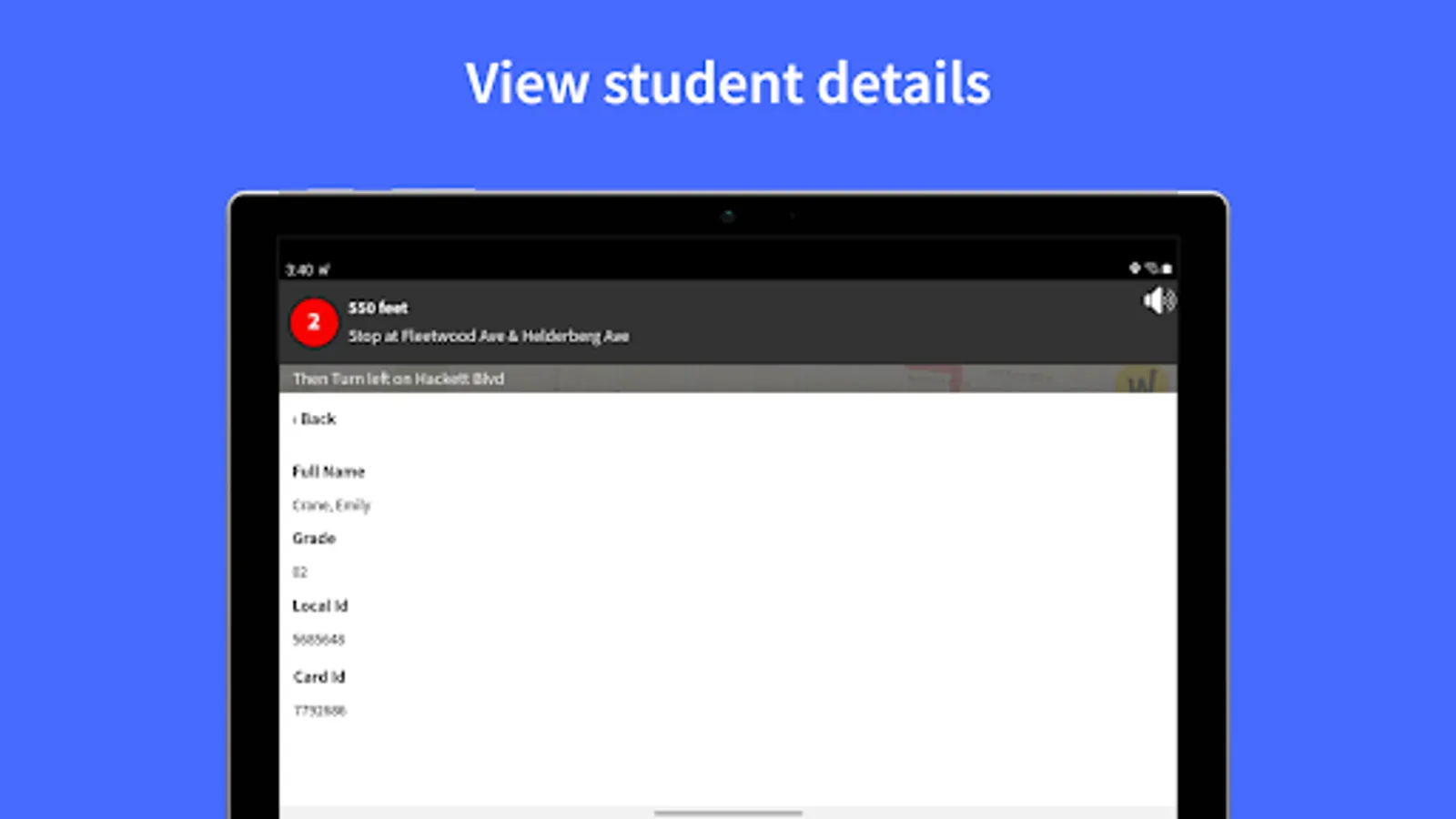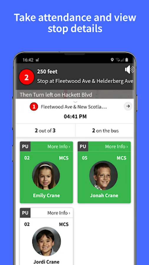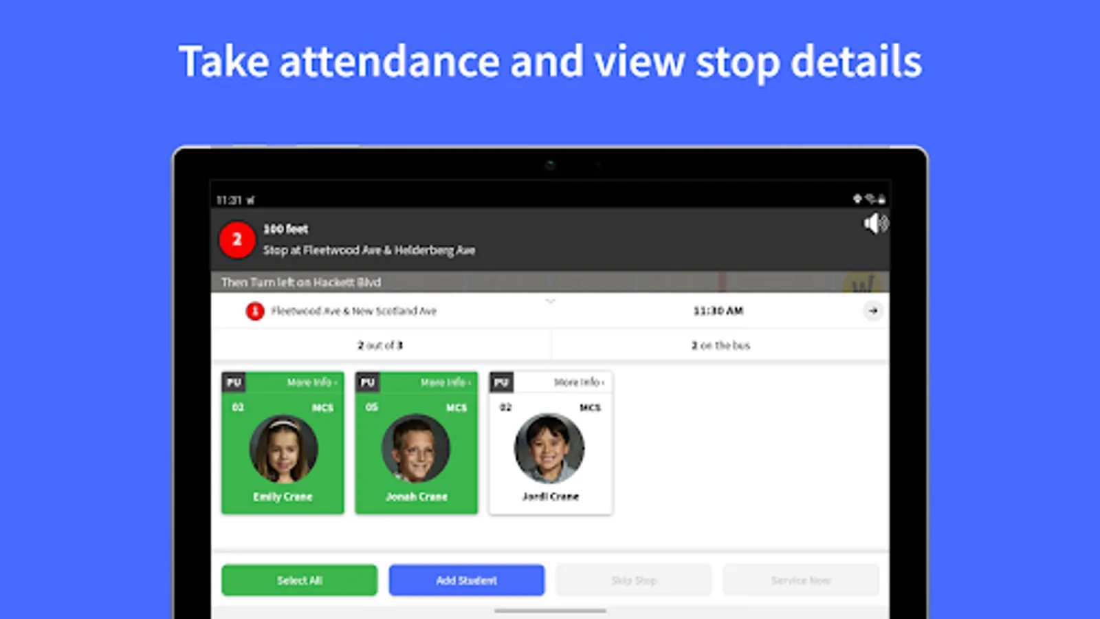 Easily take attendance at each stop, view student photos and details, and add students to a stop. Verify students are boarding the correct bus and flag students boarding the wrong bus.