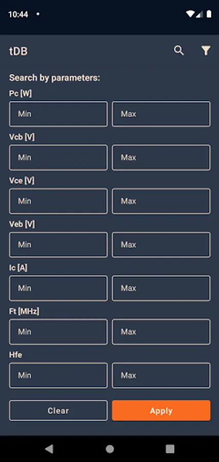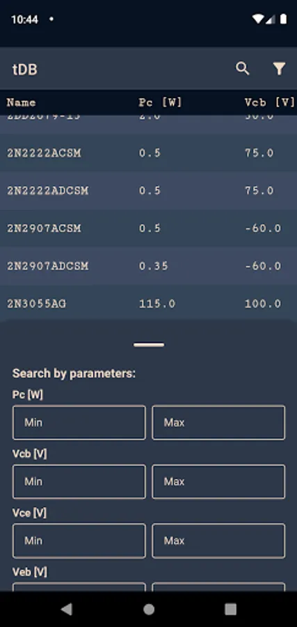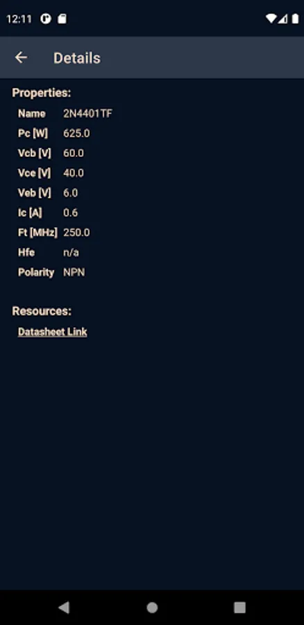 This app gives you quick search by code of the transistor, offering invaluable help in your electronics project. Most of the transistors have a link to the manufacturer's datasheet.