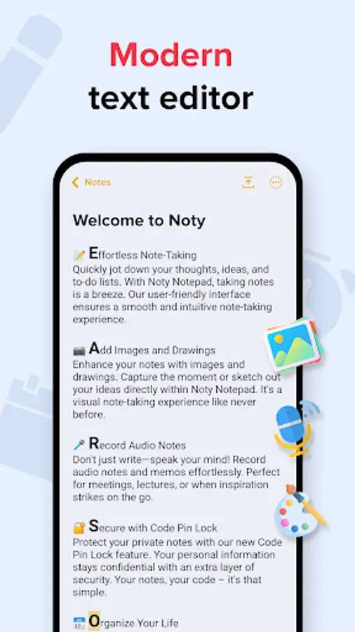 Enhance your notes with images and drawings. Capture the moment or sketch out your ideas directly within Noty Notepad. It's a visual note-taking experience like never before.