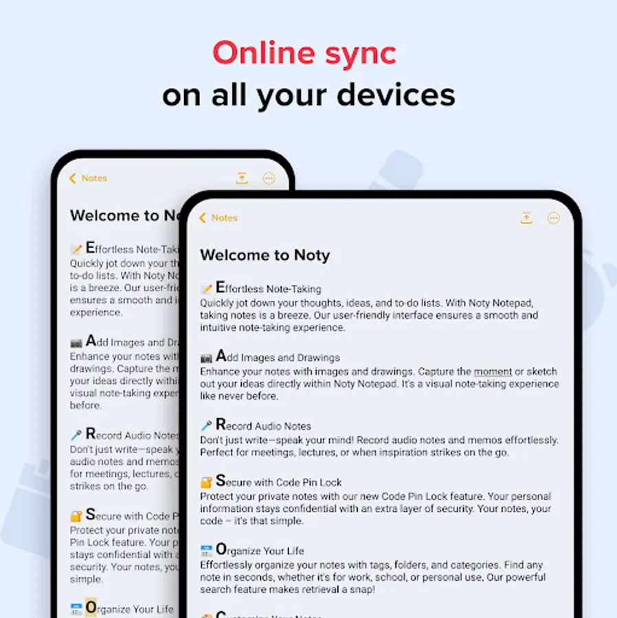 Access your notes from anywhere, anytime. Noty Notepad syncs seamlessly across all your devices, ensuring your notes are always at your fingertips.