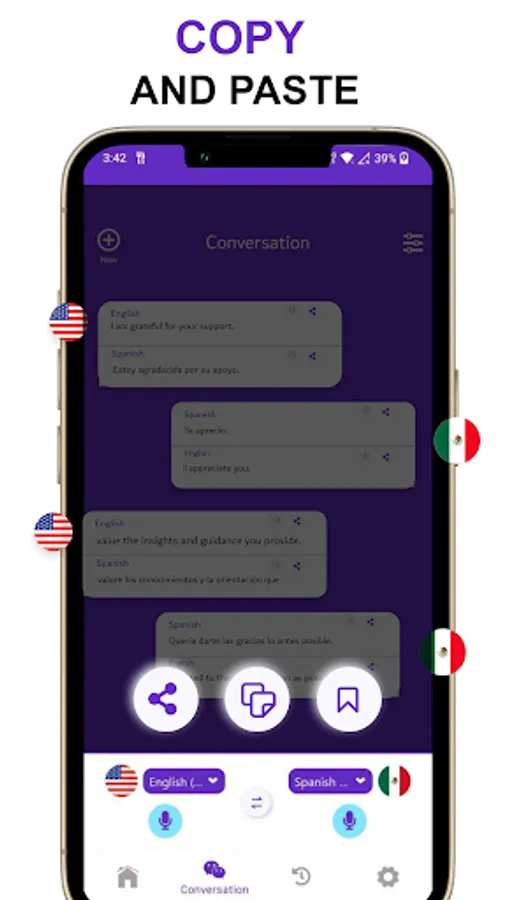 COPY AND SHARE You can easily share your translated text with your friends and family.