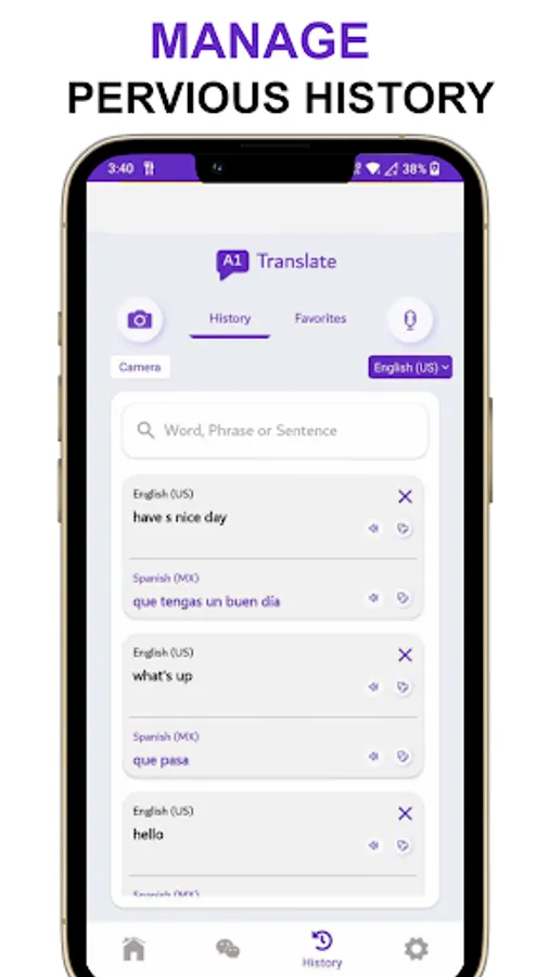 The Translate now app provides detailed history for your translations. You can pin and save your most frequent translations for later. T