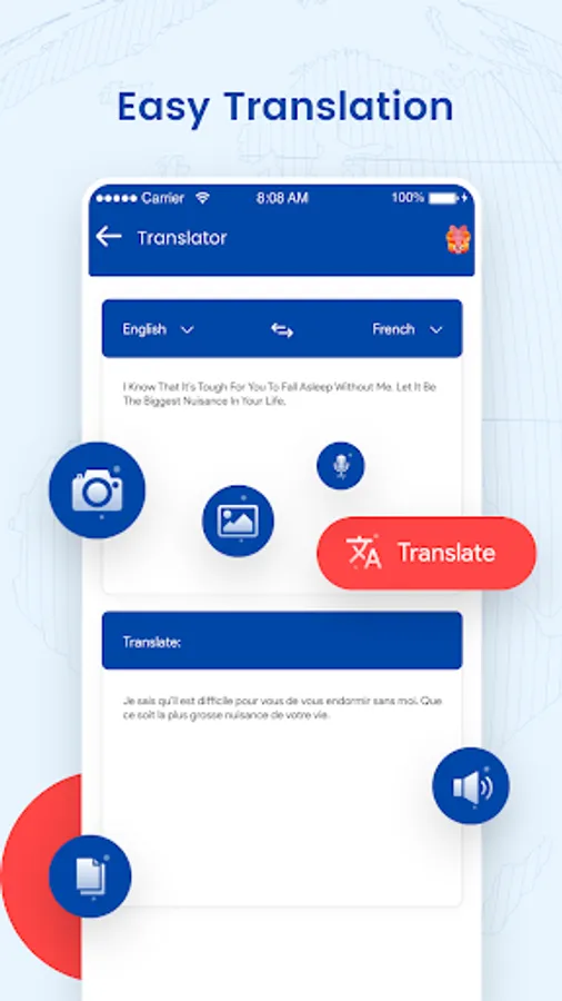With smart OCR feature, any text could be translated directly using your mobile camera without need of text input. Translator Free, Voice Text Translate All, Camera translator and photo translator app let you translate text, text from images in almost all available languages. Camera translator free very easy to understand the meaning of the text on the image with an image translator. Any text in all formats of files and images could be auto detected and translated.