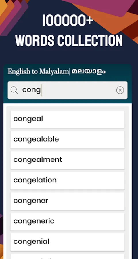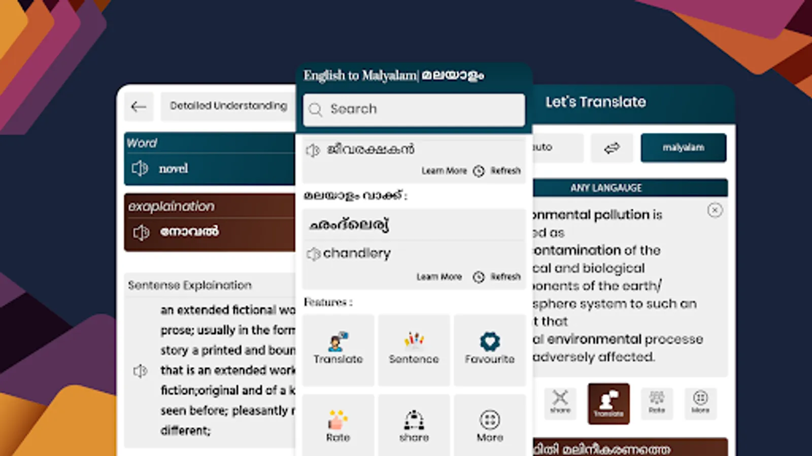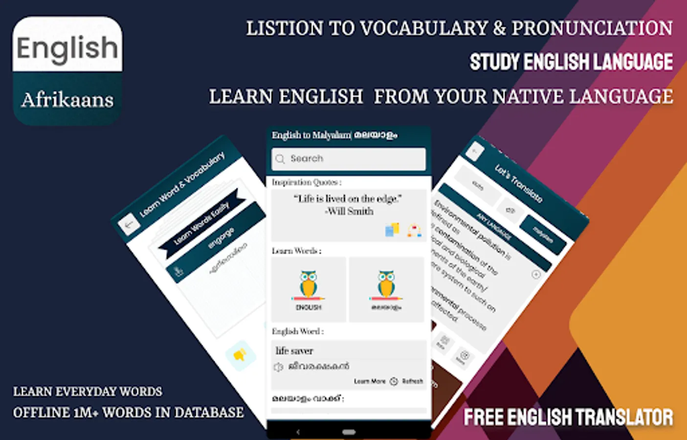 English to Malayalam translator app - Free Offline is a pocket dictionary app designed to help Malayalam speakers learn and improve their English language skills using this English to Malayalam dictionary.