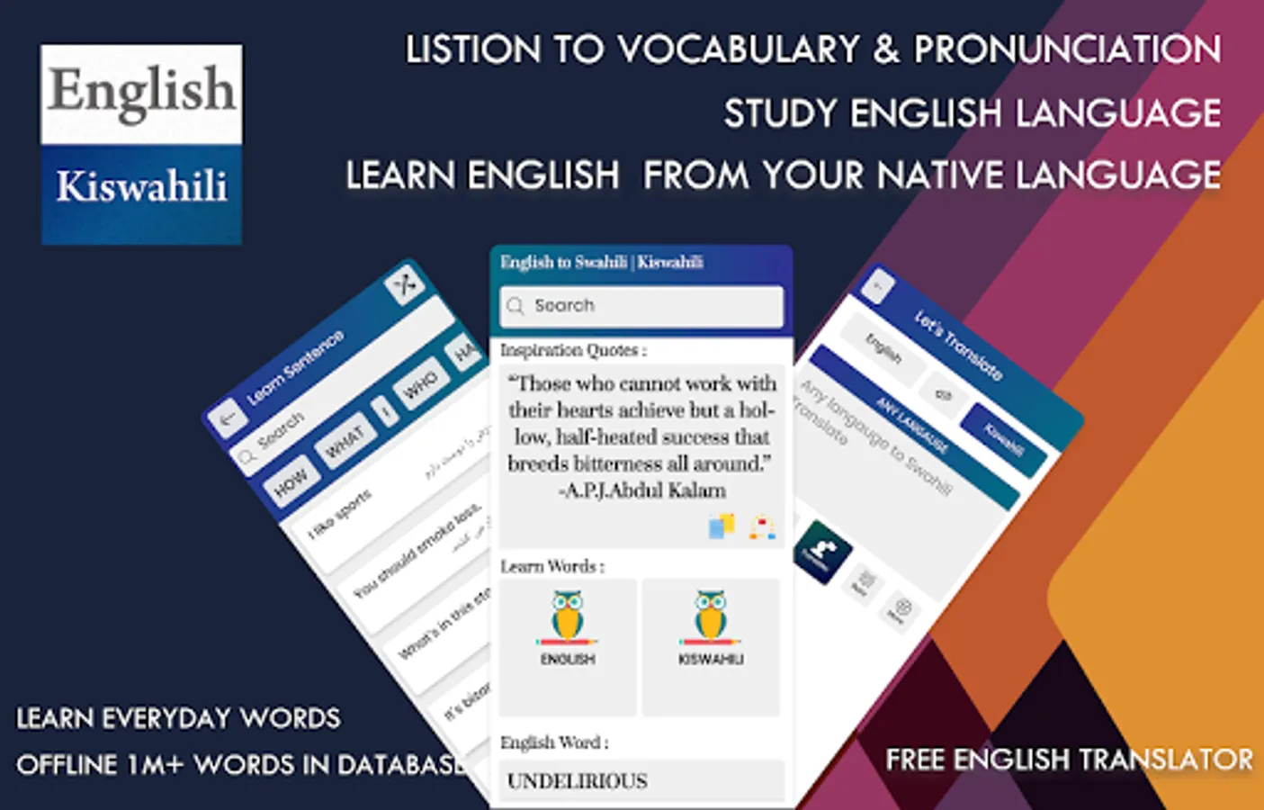 English to Swahili translator app - Free Offline is a pocket dictionary app designed to help Swahili speakers learn and improve their English language skills using this English to Swahili dictionary.