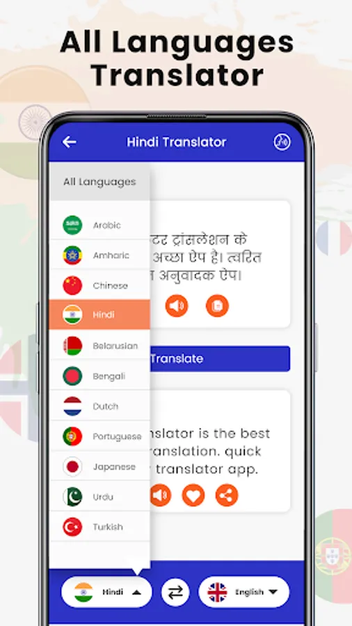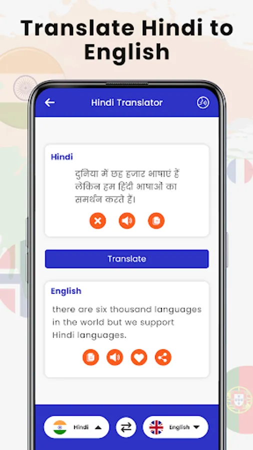 ⚈Hindi English Translator has friendly user interface to translate Hindi to English and it is easy to use language translator app.
